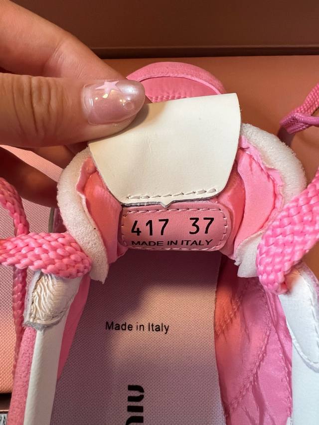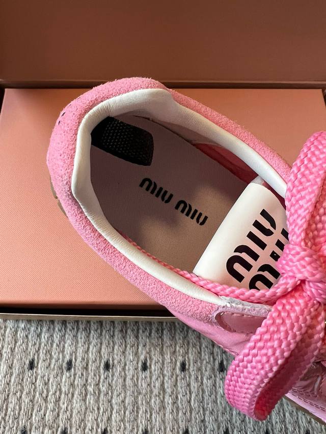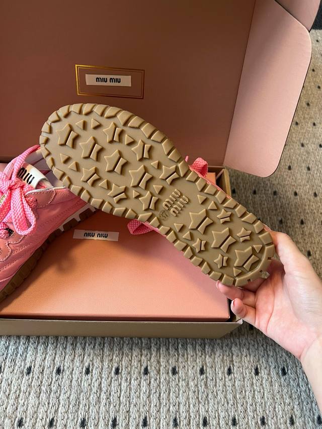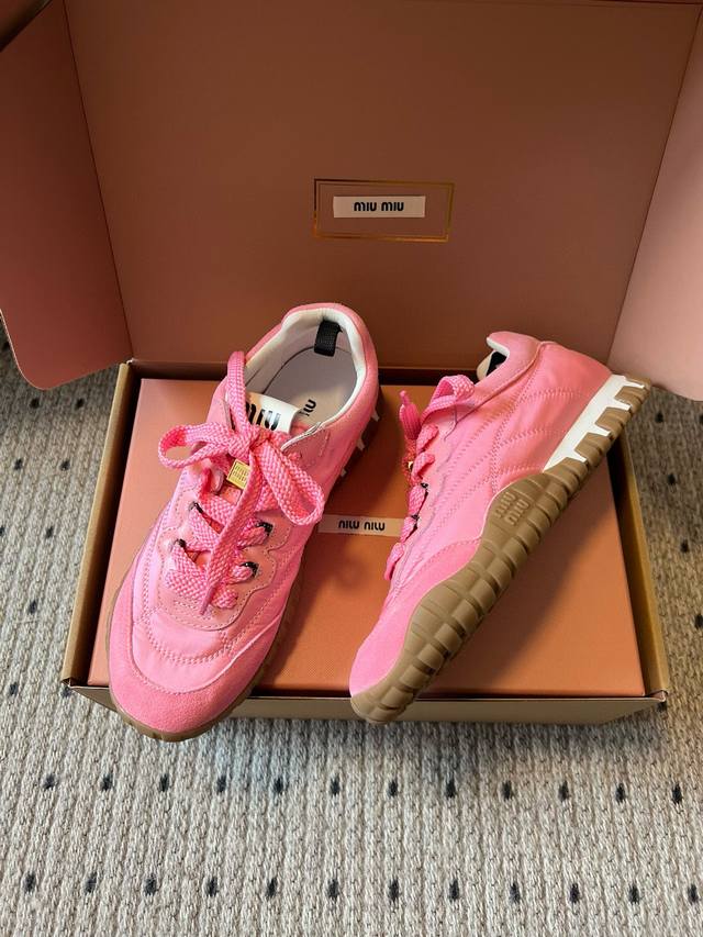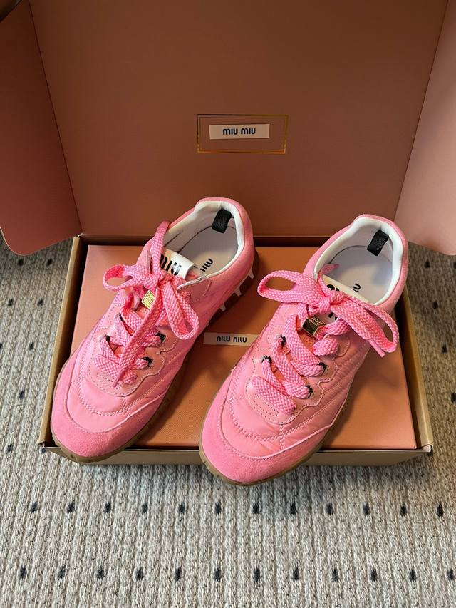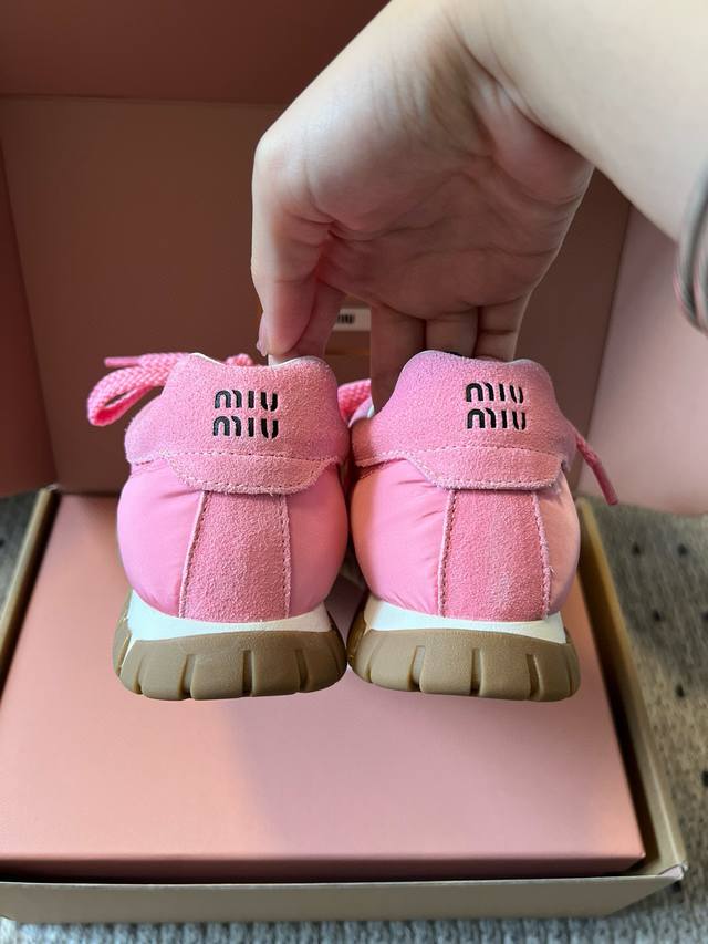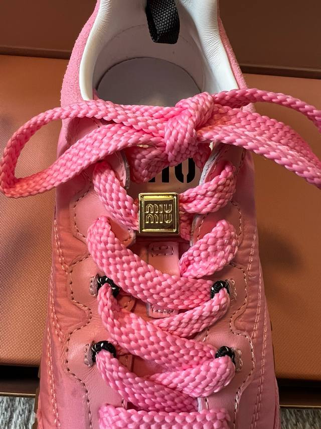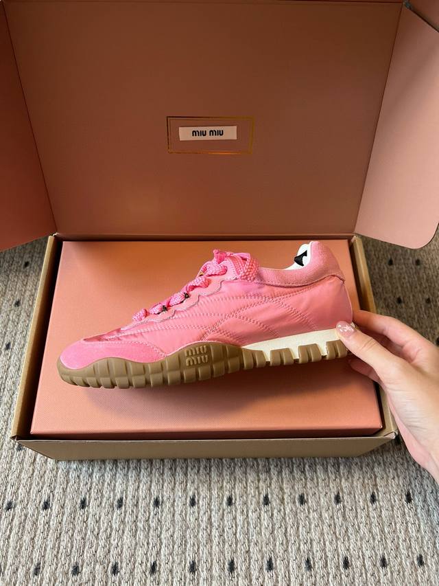 Miu Mi* 25Fw Deck Shoes新款拼接休闲运动鞋 DDD 鞋面采用尼龙与麂皮拼接材质,质感丰富且兼具实用性;鞋带设计精致,搭配金属装饰,提升了鞋款的精致感。属于复古运动鞋型,鞋身线条复古经典,厚底设计不仅增加了时尚感,还具有一定的增高效果;鞋舌处的品牌标识清晰可见,彰显品牌身份。 DDD 选择一条黑色皮质短裙,搭配一件白色露脐T恤,再穿上粉色的这款鞋子,甜酷感十足,尽显个性与时尚。可以搭配一条灰色运动裤,上衣选择一件宽松的连帽卫衣,无论是浅棕色还是粉色鞋子,都能打造出随性自在的休闲风格。