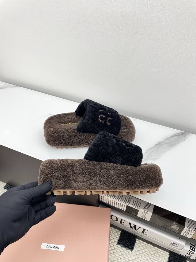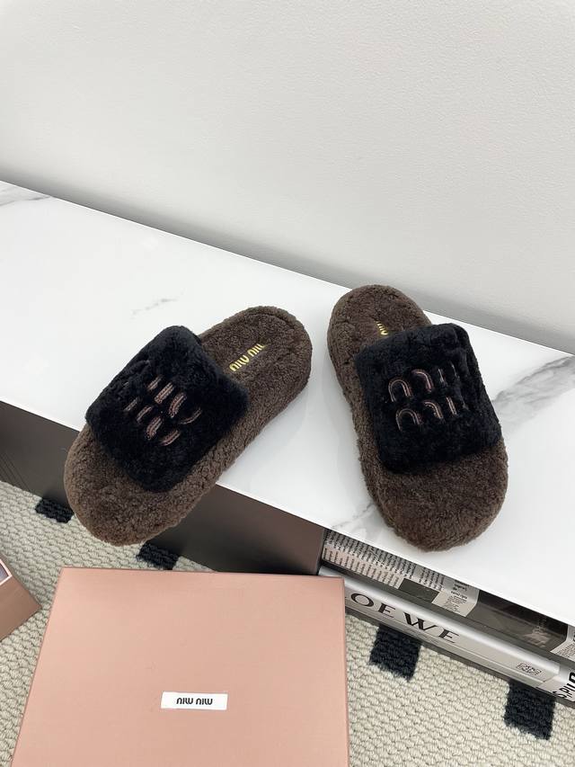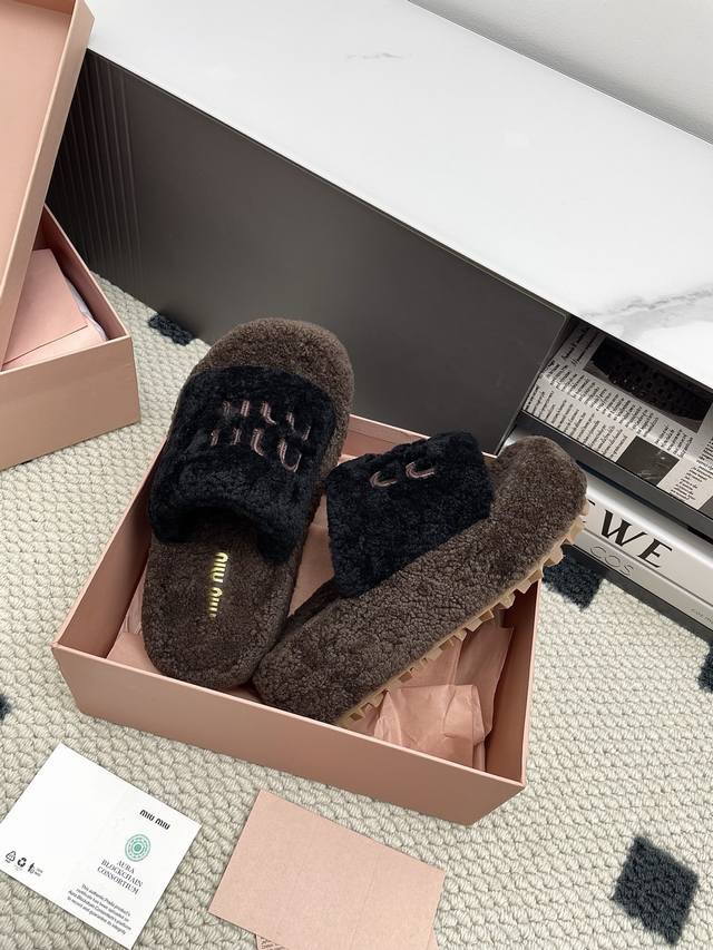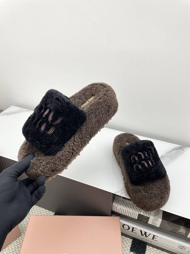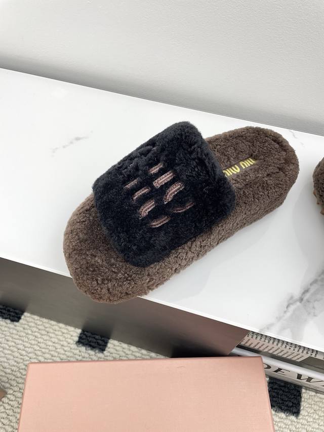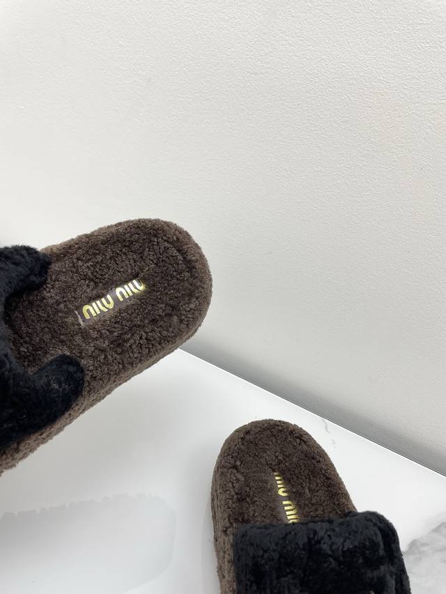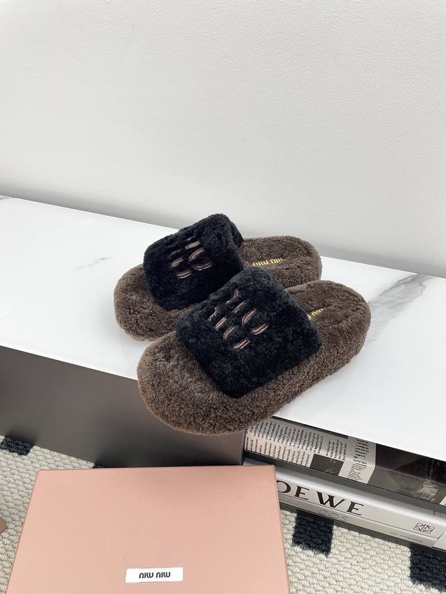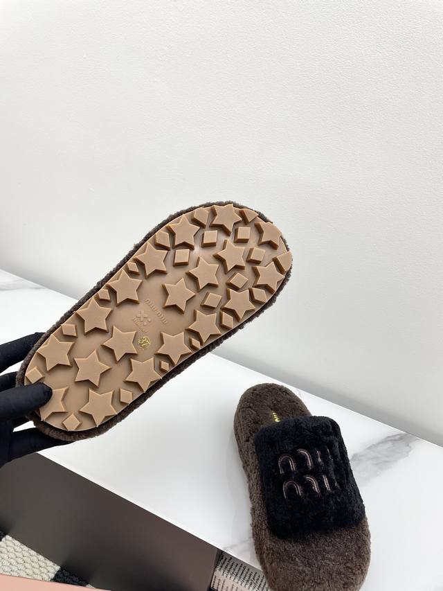 这双毛拖绝对是今年不能错过的时尚单品。整双鞋被软糯的羊羔毛包裹 亲肤又保暖,鞋面上标志性的Miu Miu字母点,瞬间拉高辨识度 在一众毛拖里脱颖而出,经典又不失俏皮 轻松彰显你的独特品味。,厚底设计简直是小个子的福音,悄悄藏着增高小心机 穿上秒变大长腿