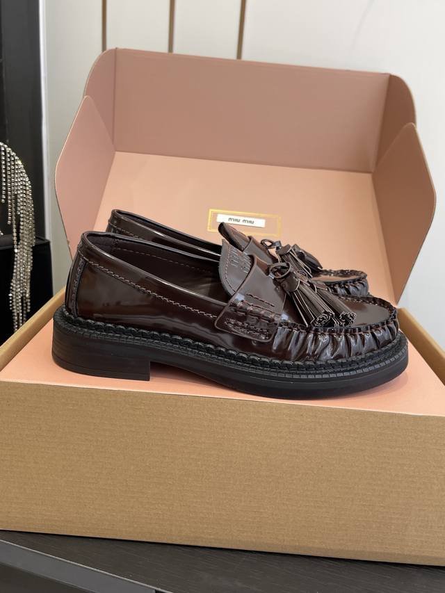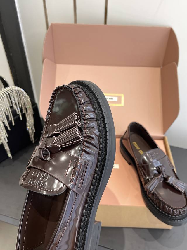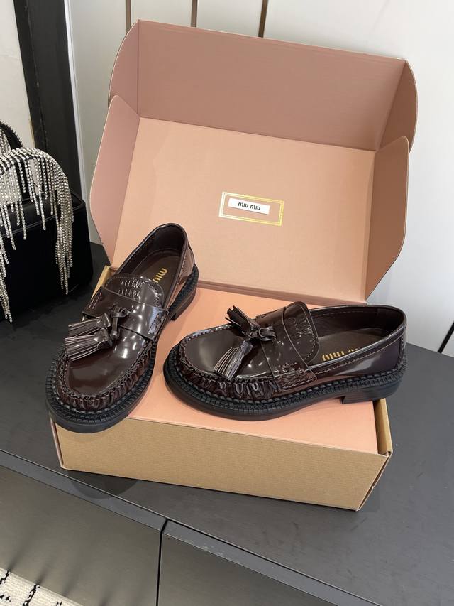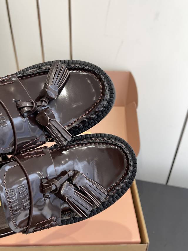 Miu Miu 25Fw Deck Shoes新款流苏乐福鞋 融合复古与时尚,乐福鞋的经典版型搭配流苏装饰,增添灵动俏皮感;厚底设计又带有些许复古英伦风,同时提升了造型的层次感。采用优质皮革材质,质感细腻且光泽感佳,鞋身的缝线工艺精致,流苏细节处理考究,彰显品牌的精致做工。 搭配百褶裙和白色衬衫,再外搭一件针织开衫,打造清新减龄的校园风格,鞋子的流苏元素与学院风的活泼感相得益彰。 鞋面:牛皮 内里:牛皮 大底:原版开模大底 码数:35-40 40订做