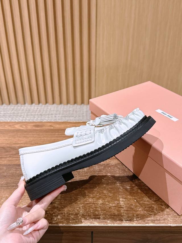 Miu Miu 25Fw Deck Shoes 缪缪新款流苏乐福鞋 DDD 融合复古与时尚,乐福鞋的经典版型搭配流苏装饰,增添灵动俏皮感;厚底设计又带有些许复古英伦风,同时提升了造型的层次感。采用优质皮革材质,质感细腻且光泽感佳,鞋身的缝线工艺精致,流苏细节处理考究,彰显品牌的精致做工。 DDD 搭配百褶裙和白色衬衫,再外搭一件针织开衫,打造清新减龄的校园风格,鞋子的流苏元素与学院风的活泼感相得益彰。 DDD 鞋面:牛皮 DDD 内里:牛皮 DDD 大底:原版开模大底 DDD Size:35-39 40定