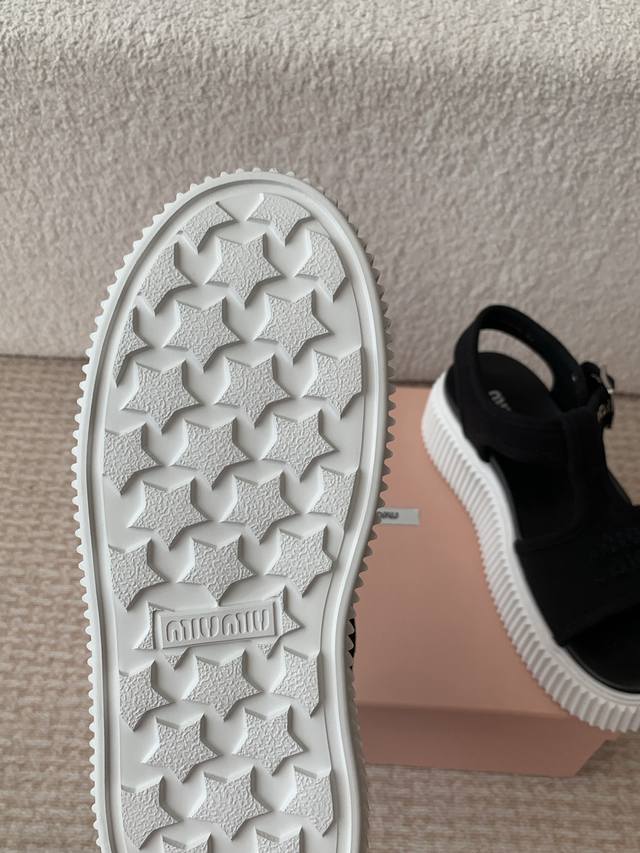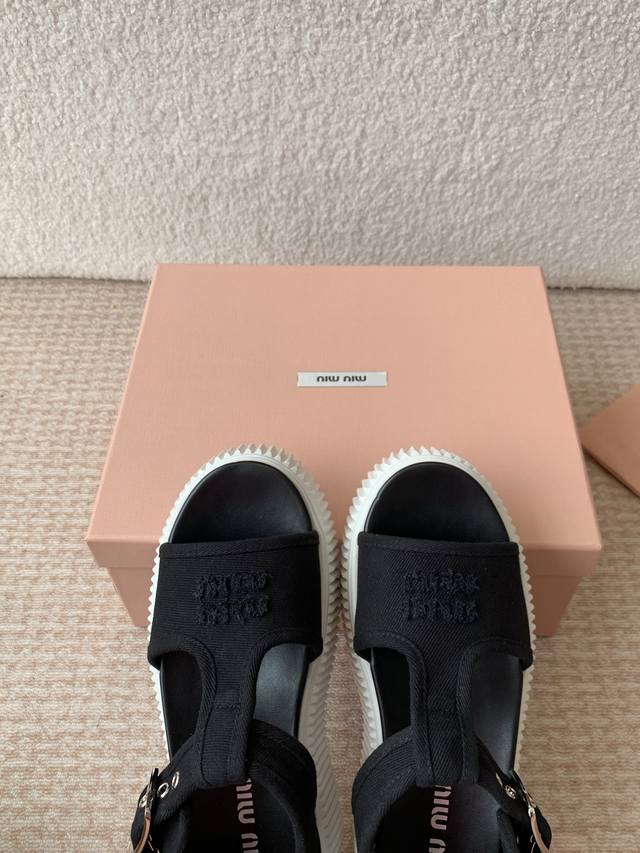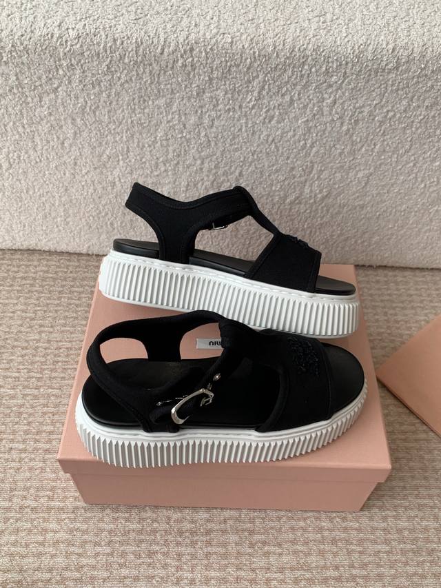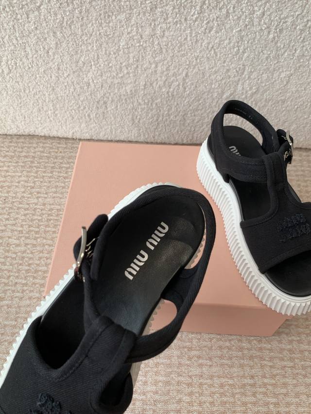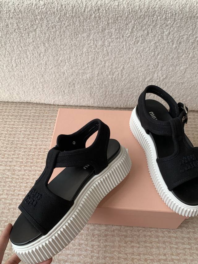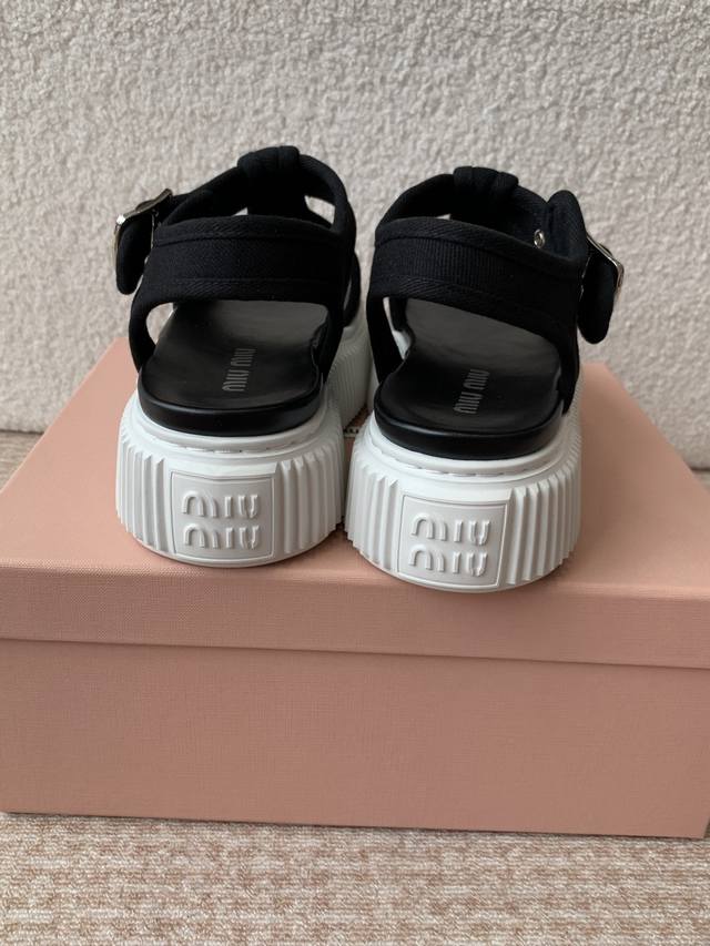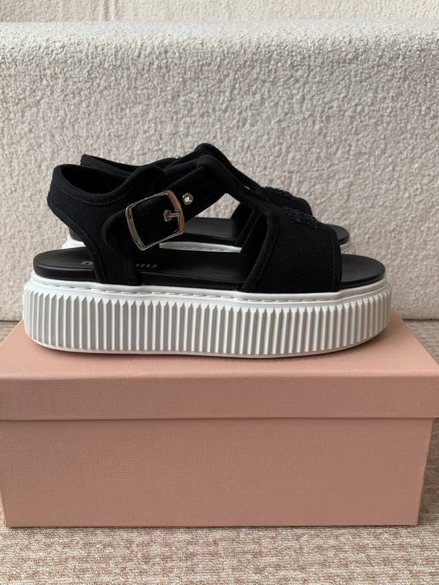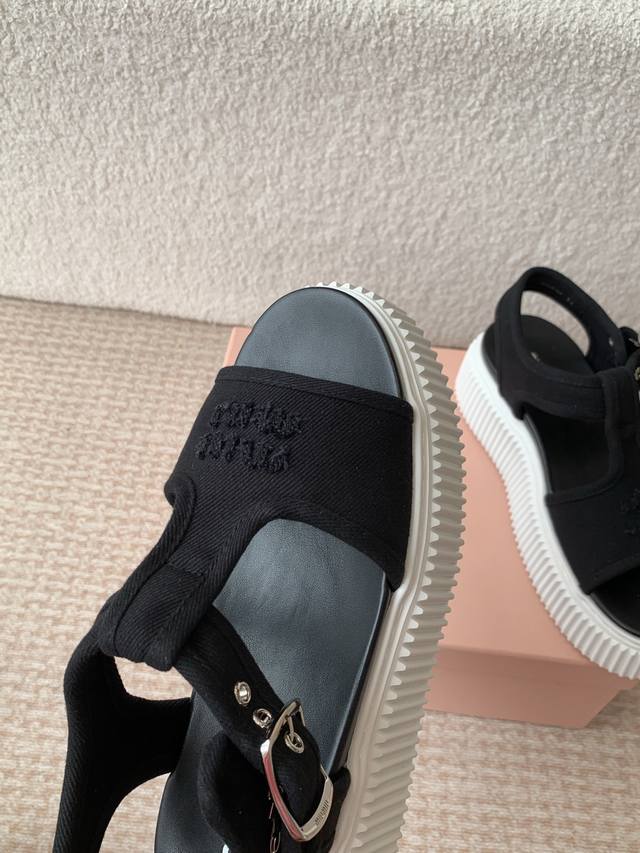 Miu Miu 25Ss春夏新款松糕厚底帆布罗马露趾休闲凉鞋