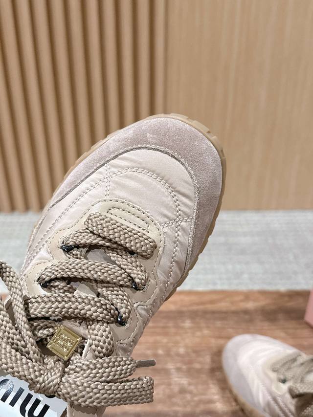 Miu Miu Deck Shoes 缪缪新款拼接休闲运动鞋 鞋面采用尼龙与麂皮拼接材质,质感丰富且兼具实用性;鞋带设计精致,搭配金属装饰,提升了鞋款的精致感。属于复古运动鞋型,鞋身线条复古经典,厚底设计不仅增加了时尚感,还具有一定的增高效果;鞋舌处的品牌标识清晰可见,彰显品牌身份。 选择一条黑色皮质短裙,搭配一件白色露脐T恤,再穿上粉色的这款鞋子,甜酷感十足,尽显个性与时尚。可以搭配一条灰色运动裤,上衣选择一件宽松的连帽卫衣,无论是浅棕色还是粉色鞋子,都能打造出随性自在的休闲风格。 鞋面:牛反绒 布面