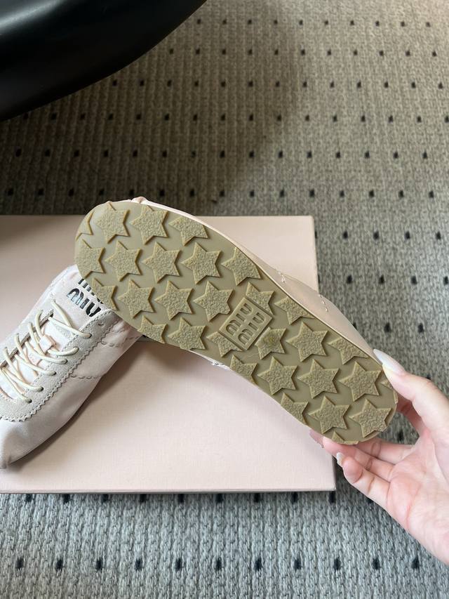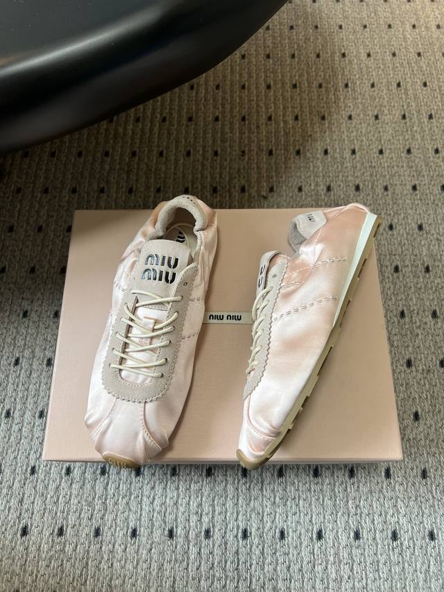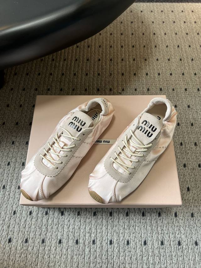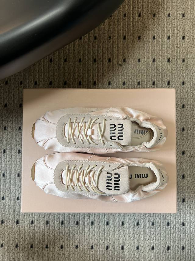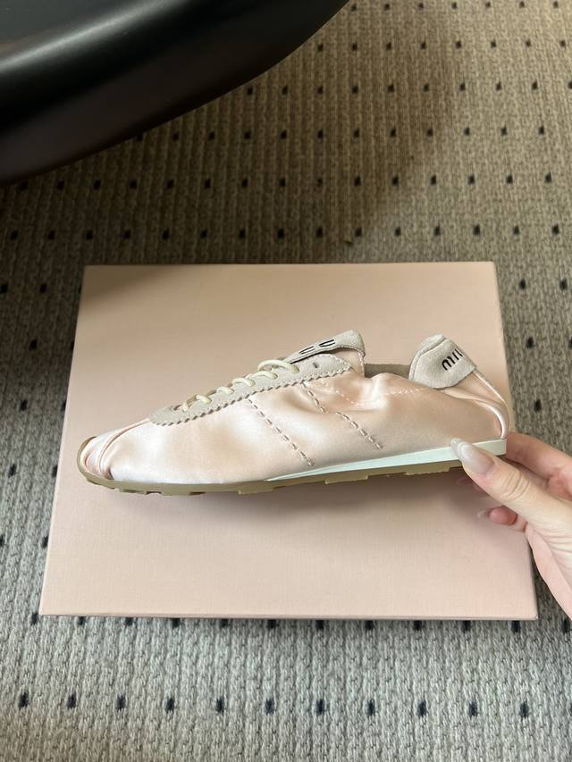 Miumi* plume系列缎面芭蕾德训鞋休闲鞋 DDD 把德训鞋的休闲运动感和芭蕾舞鞋的优雅柔和结合,既有复古运动风,又带法式芭蕾的精致感。缎面鞋面自带光泽褶皱,麂皮增加柔雾感,视觉和触感都很高级。 DDD 搭配扁平鞋带,鞋型偏窄巧,鞋头圆润+浅色橡胶平底,轻盈又显脚小。皮革内底,上脚软和舒适,平底设计日常走路也不累。颜色多选,能搭裙子、牛仔裤,是甜酷风合芭蕾风穿搭的热门单品。 DDD 鞋面:高丝光牛反绒 真丝布 Ddd 内里:布 羊皮 Ddd 大底:橡胶大底 Ddd 增高:2Cm Ddd 码数:35
