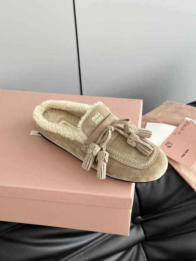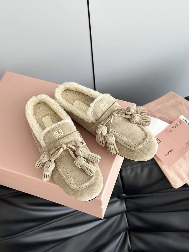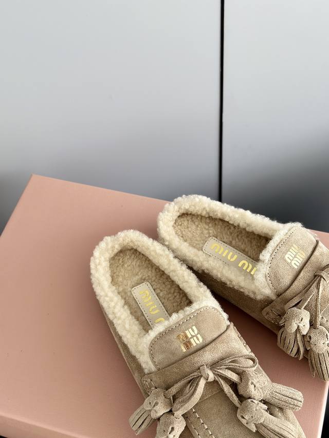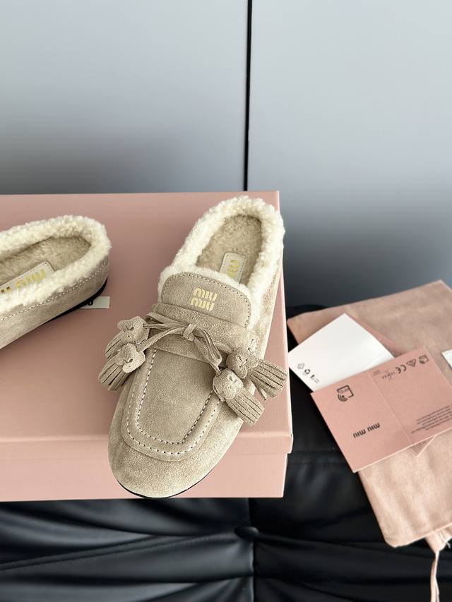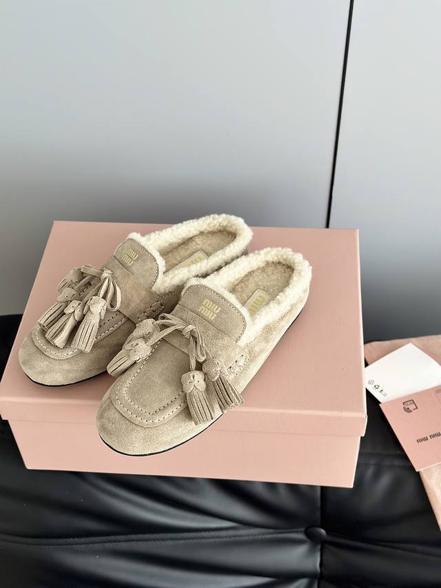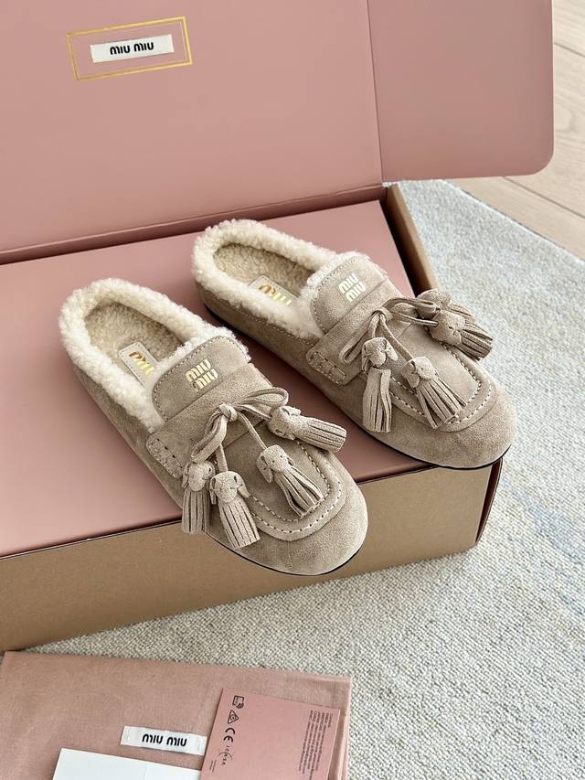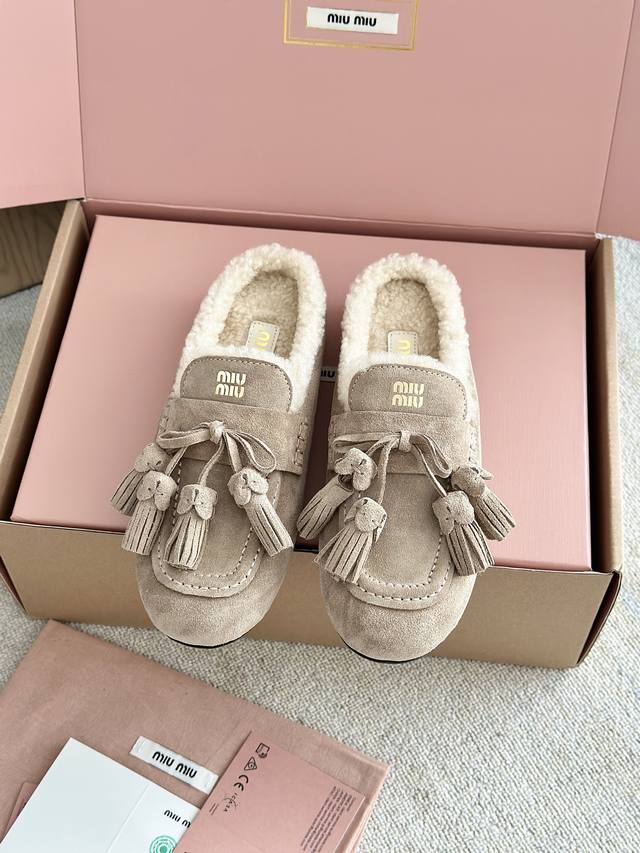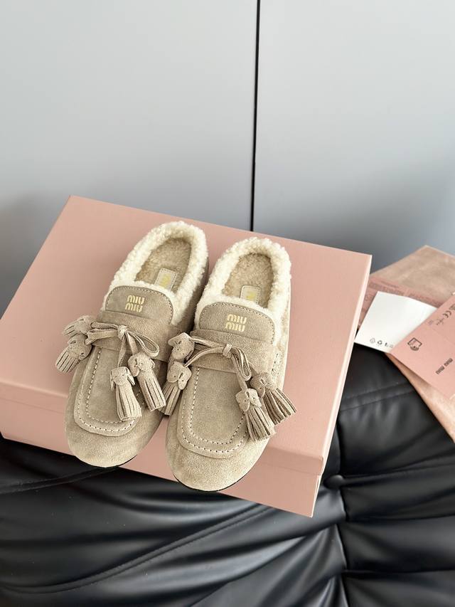 Miumi*2025秋冬流苏羊羔毛羊毛懒人半拖穆勒拖鞋 飞机盒包装 麂皮流苏乐福鞋 中古美感 新版型麂皮乐福鞋不基础 流苏设计带着一点复古的禅意的感觉 这款不过