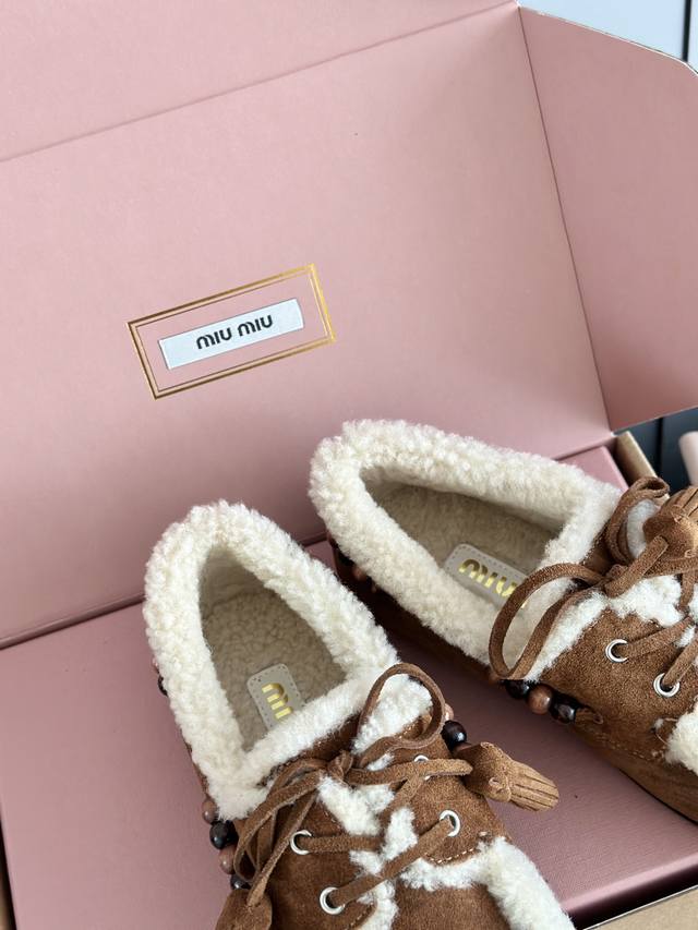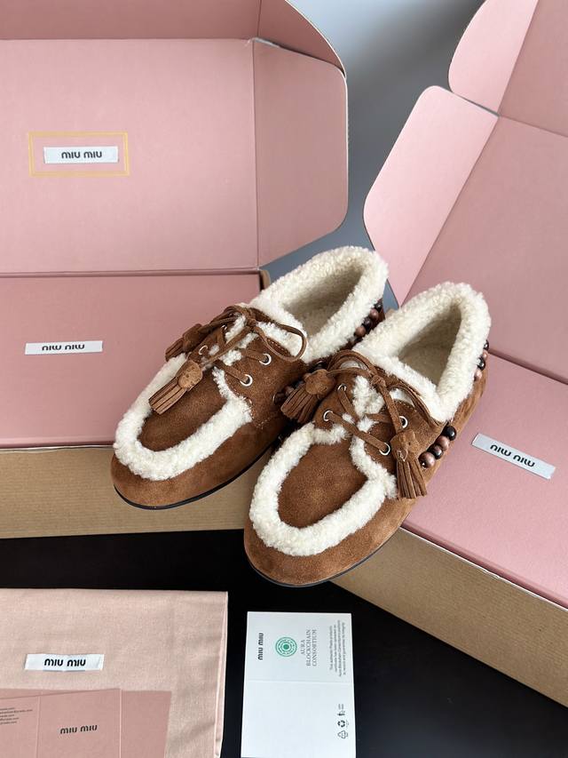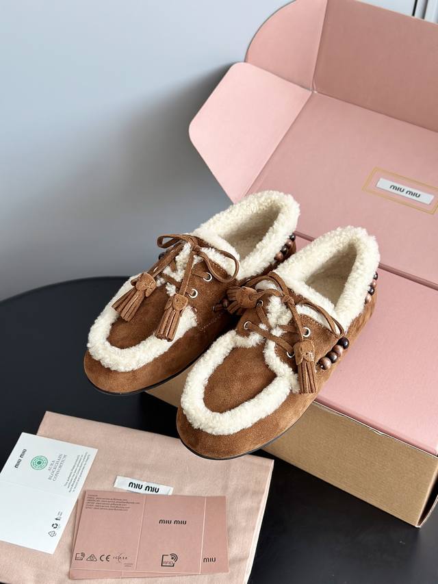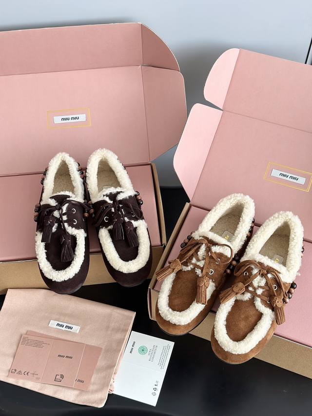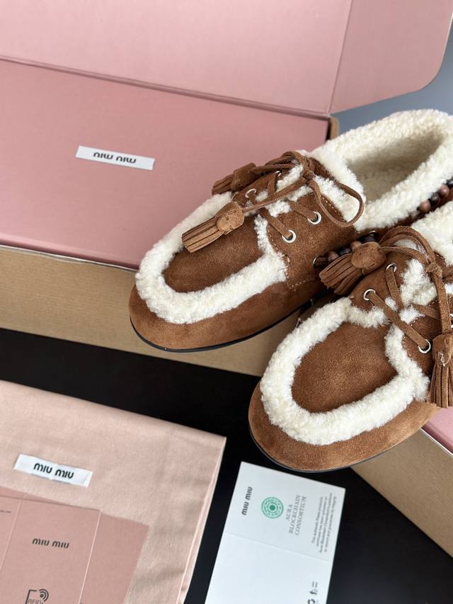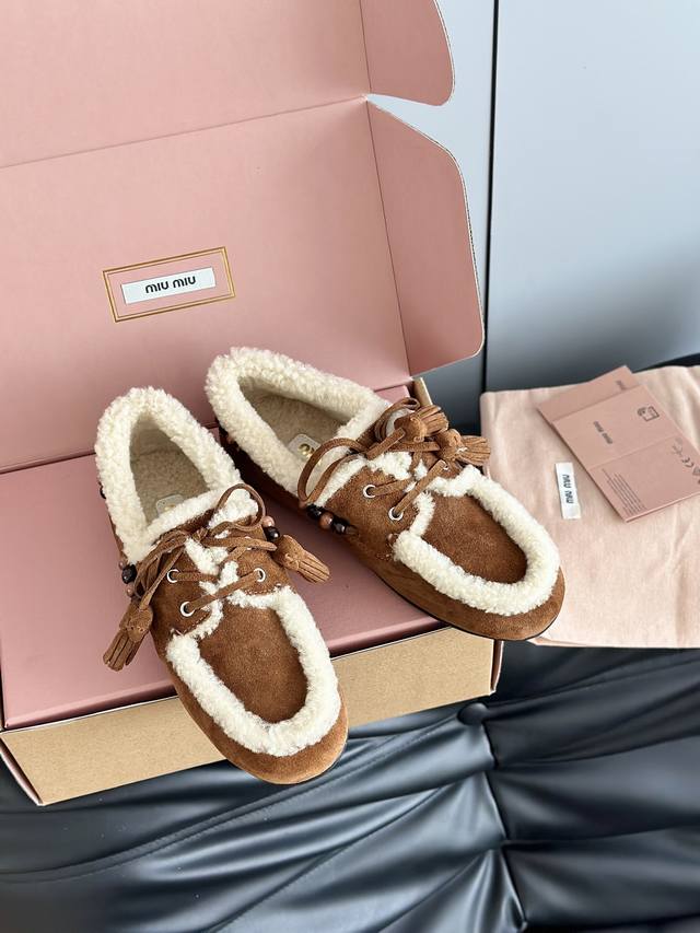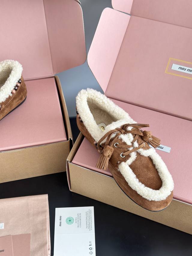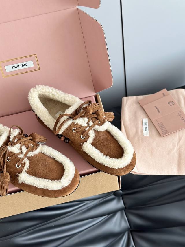 Miumi*25新款羊羔毛流苏乐福鞋 Deck Shoes 羊毛乐福鞋,有棕色、深棕色等复古色调可选;鞋边和鞋口点缀白色毛绒,形成鲜明对比,既保暖又增添可爱氛围