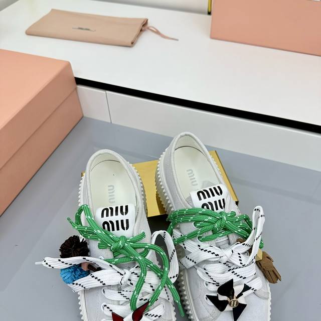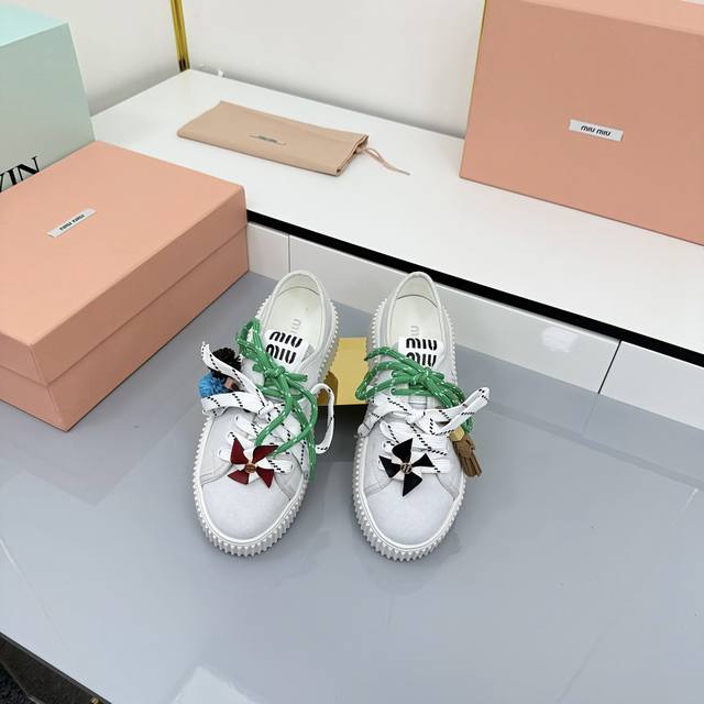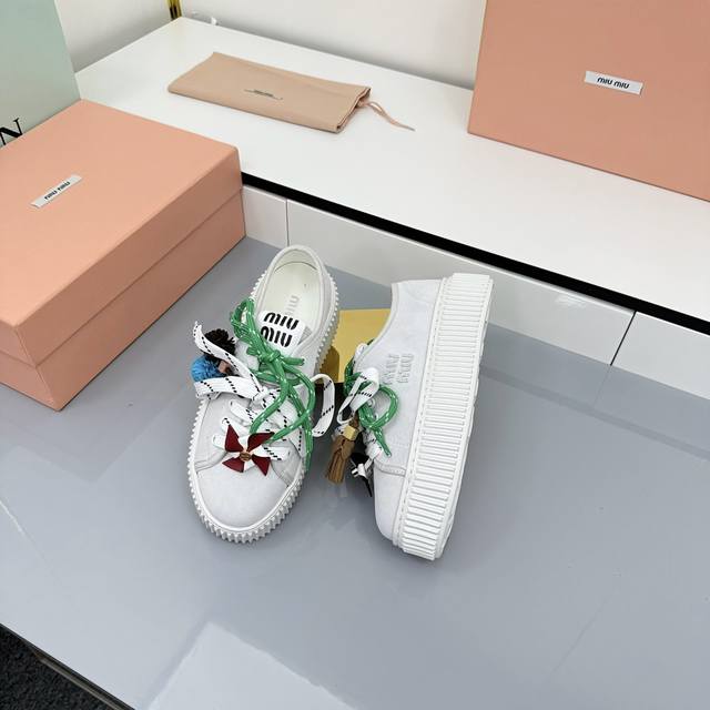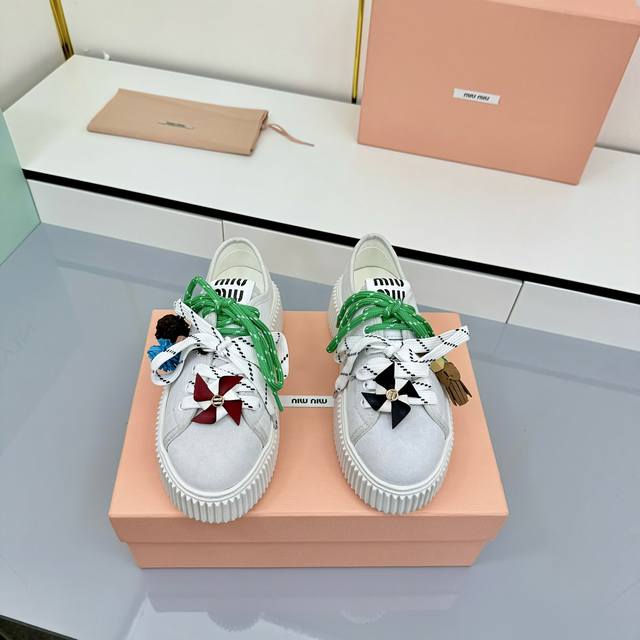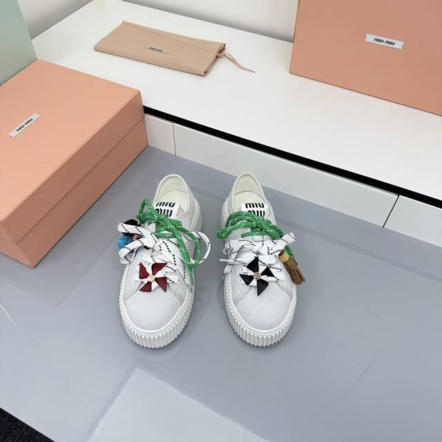 Miumiu新款擦色脏脏小白鞋依旧经典时尚 简约的格板设计!品质灰常牛!Miumiu 擦色脏脏小白鞋,前卫大胆的Miumiu风格融于此款漂白皮革运动鞋的简约线条