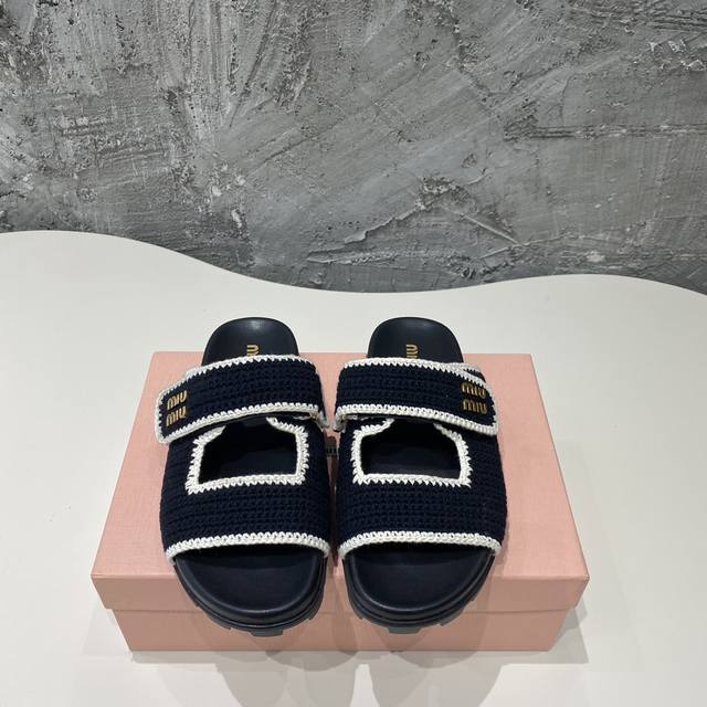 Miumiu缪缪两带魔术贴 编织 厚底 平底 拖鞋