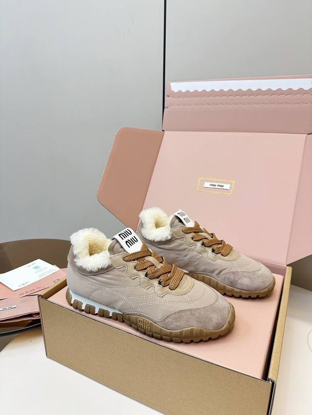 Miumiu缪缪秋冬新品毛绒德训鞋 Miumiu 2025秋冬新款毛绒德训鞋,织物+绒面皮革拼接,内里柔软毛绒,穿着超舒适又保暖 橡胶轮胎底,耐磨抓地力强,日常