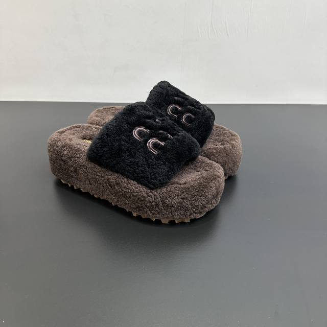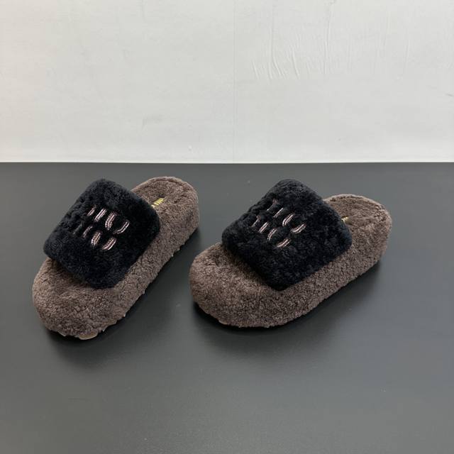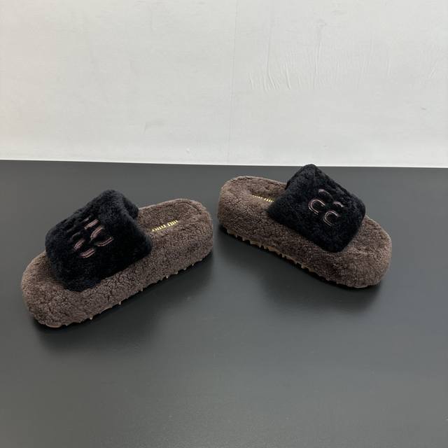 Miumiu缪缪秋冬新款松糕底厚底毛毛拖 每逢秋冬来临 毛拖是必不可少的单品 不仅足够保暖 还能拥有舒适的触感无论搭配什么都有种漫不经心的时髦纯羊毛有用手拨开是