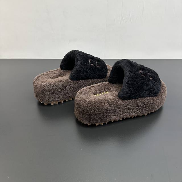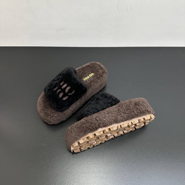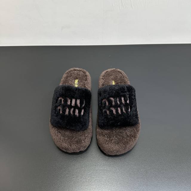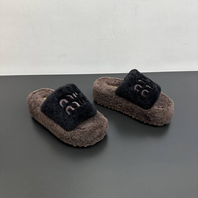 Miumiu缪缪秋冬新款松糕底厚底毛毛拖 每逢秋冬来临 毛拖是必不可少的单品 不仅足够保暖 还能拥有舒适的触感无论搭配什么都有种漫不经心的时髦纯羊毛有用手拨开是厚厚实实的 份量感足 内里垫脚真羊毛 软软的脚感我爱了定制原版橡胶大底 底片耐磨防滑Csize:35-41 40 41定制