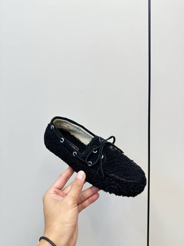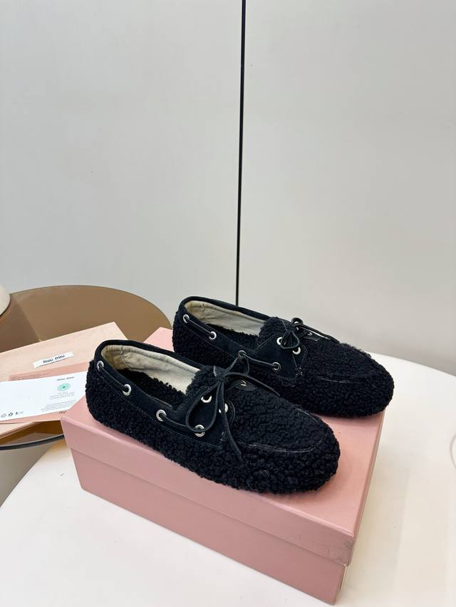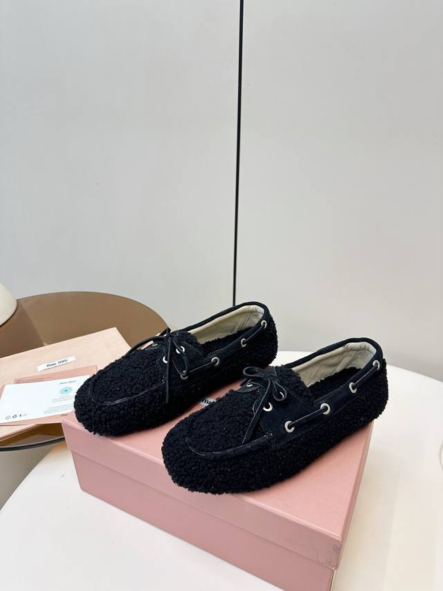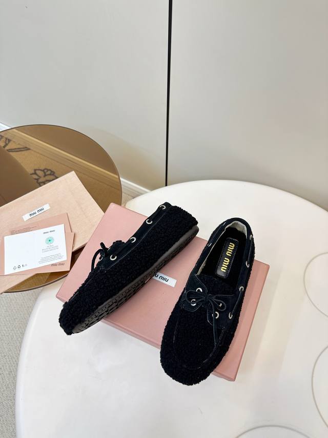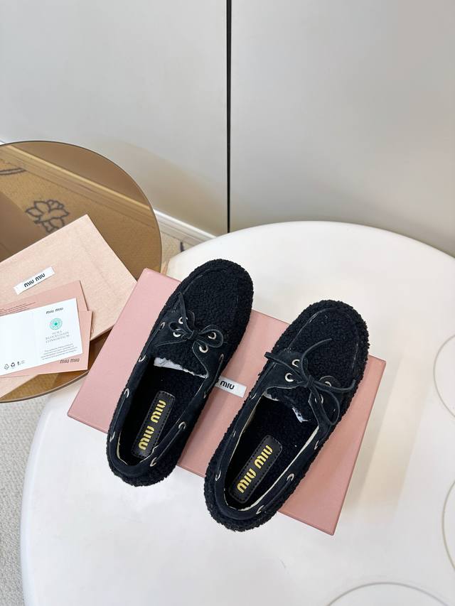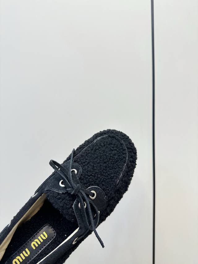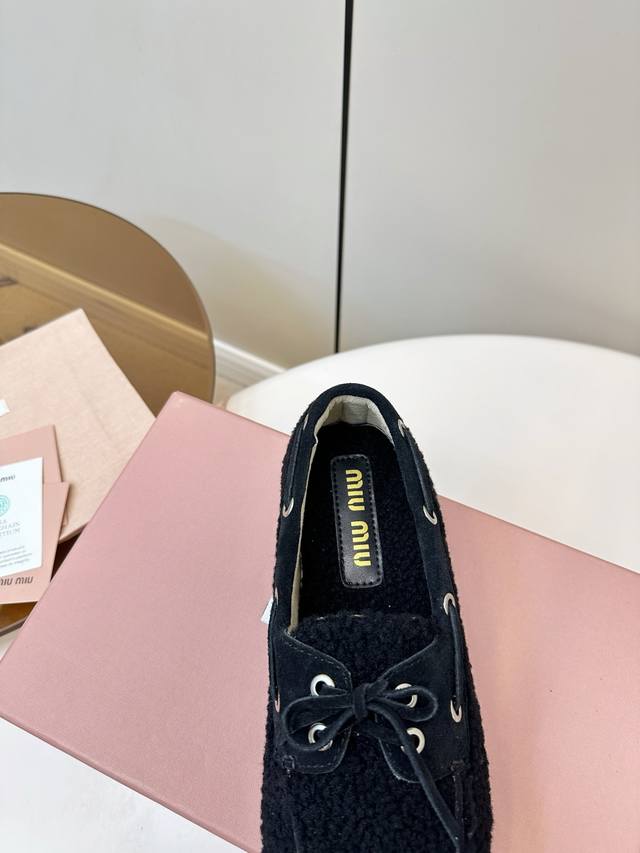 Miumiu|缪缪羊羔毛美拉德风乐福鞋 Miu Miu这款白色羊毛乐福鞋,柔软羊毛+麂皮拼接,质感超细腻!经典乐福鞋型+系带设计,复古又舒适,秋冬穿超暖和 鞋底