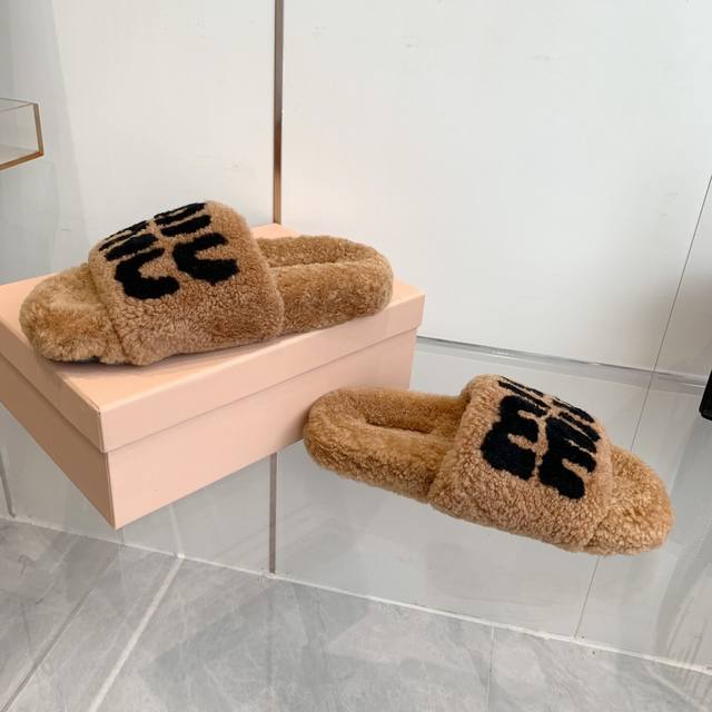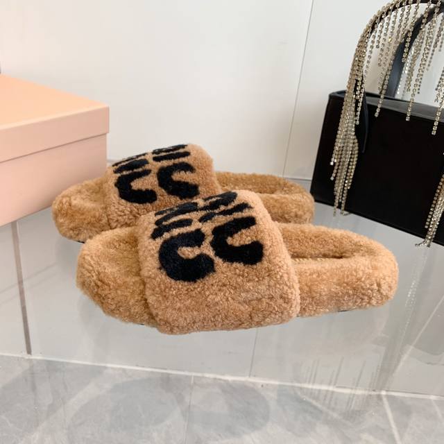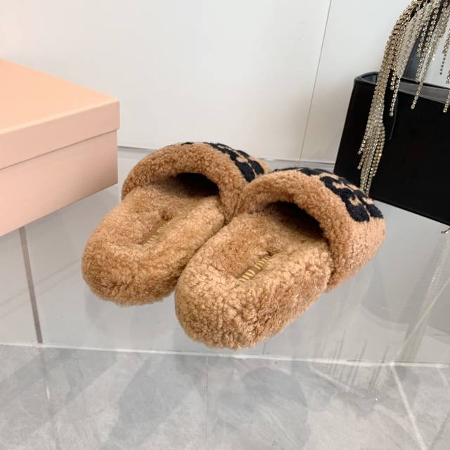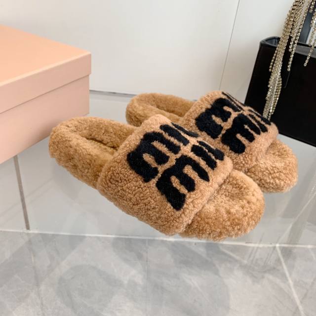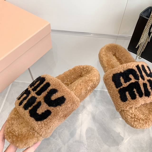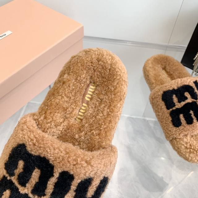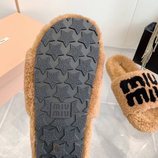 Miumiu 新色羊毛拖鞋頂级品质纯皮毛一体羔羊毛打造!米超温暖的感觉,穿上仿佛踩在云朵上经典字母装饰,精致高级!让这双毛拖身价陡增!鞋底是原版开模的防滑橡胶大