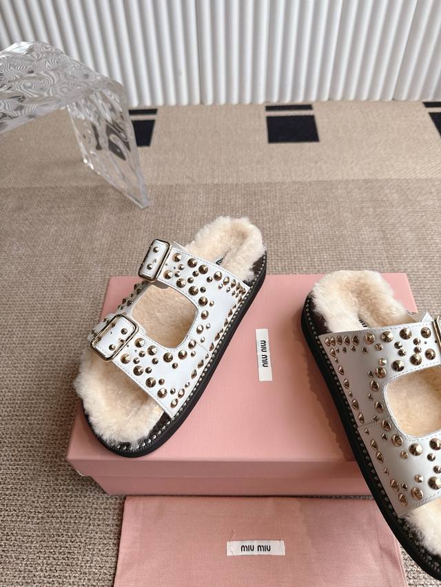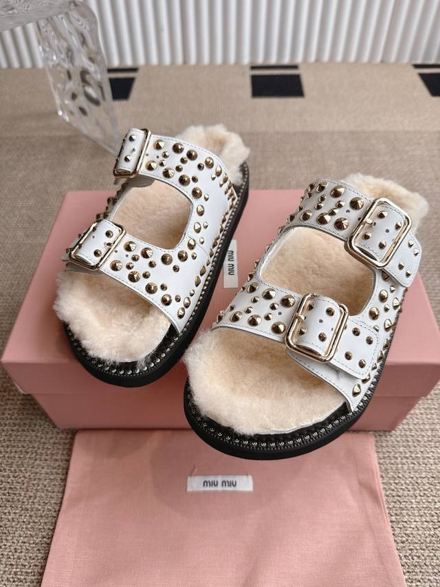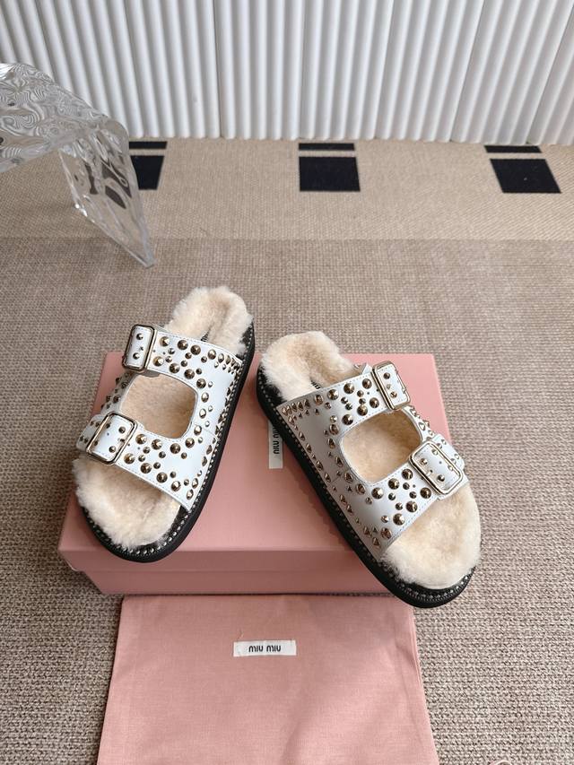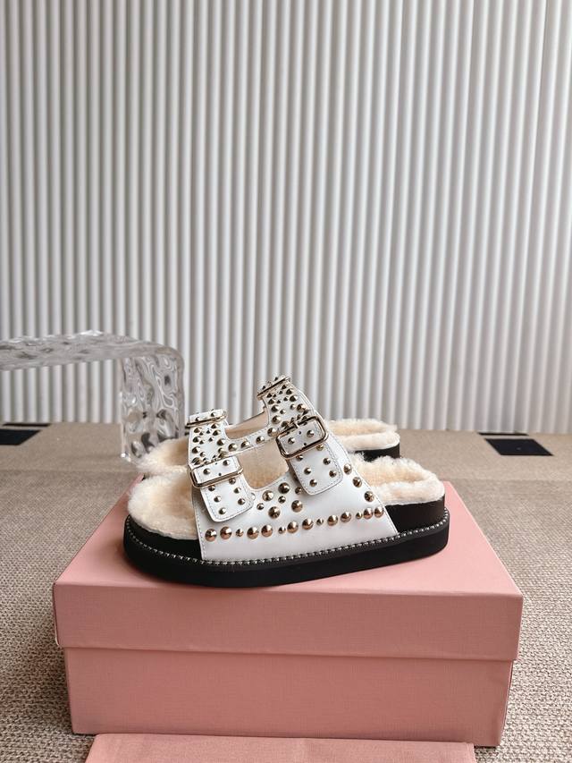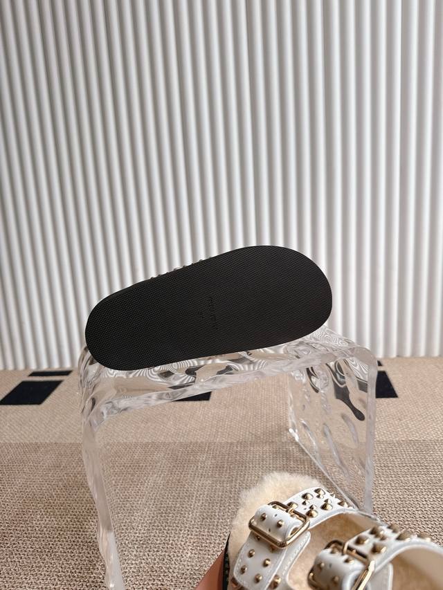 Miumiu 缪缪厚底铆钉毛拖 2025夏季新款外穿平底女鞋软底网红沙滩凉鞋简约又不失小特点的仙女鞋上线Ing 喜欢设计风的亲应该会很爱这款吧 Di一眼看太惊艳