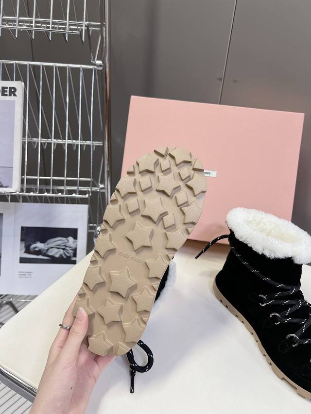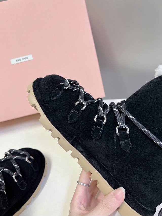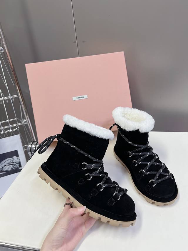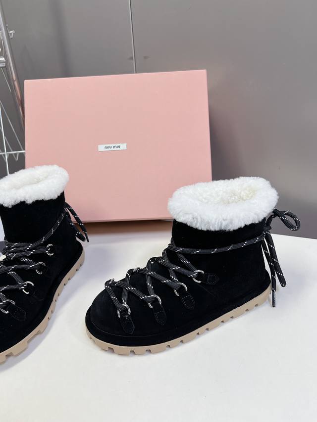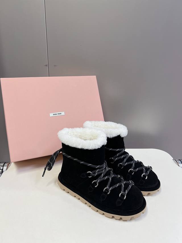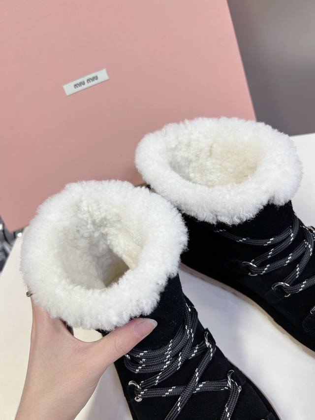 Miumiu 缪缪秋冬最新走秀款 绑带羊毛小短靴雪地靴毛毛鞋 经常出现在各大时装杂志封面 各路明星、小红书博主都有钟爱 搭配绑带设计更显优雅,上脚尤为惊艳到你的