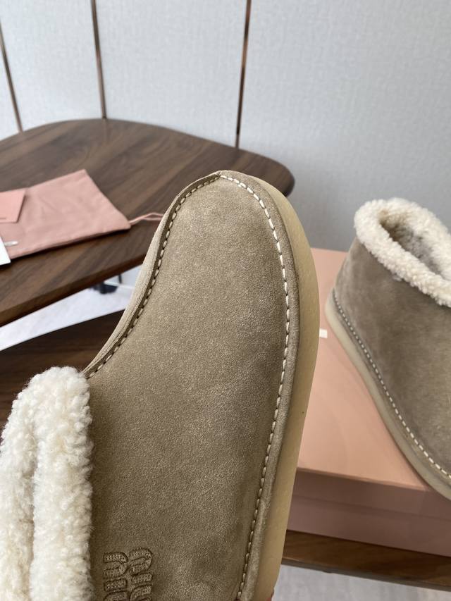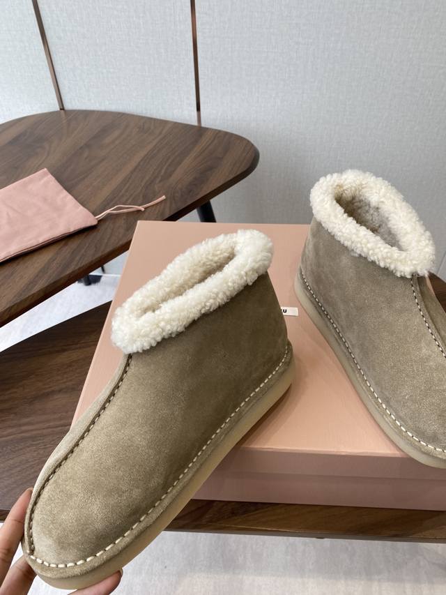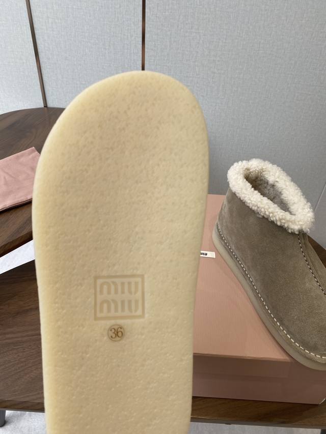 Miumiu 缪缪 25Ss秋冬走秀款 羊毛小短靴雪地靴毛毛鞋 经常出现在各大时装杂志封面 各路明星、小红书博主都有钟爱 搭配绑带设计更显优雅,上脚尤为惊艳到你的一款 闭眼入都是不会后悔 上脚非常舒服超级稳 搭配还是可咸可甜 Zp开发五金、订制颜色 鞋面:进口高丝光牛反绒 内里:进口羊毛内里 鞋底:Zp开模大底 Size:#35-41 40 41订做不退换