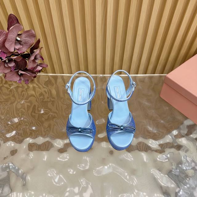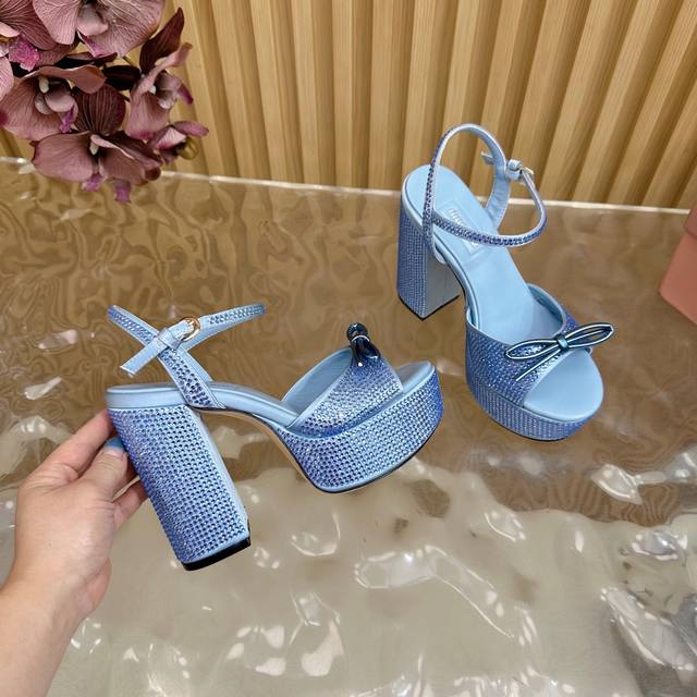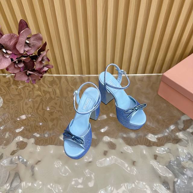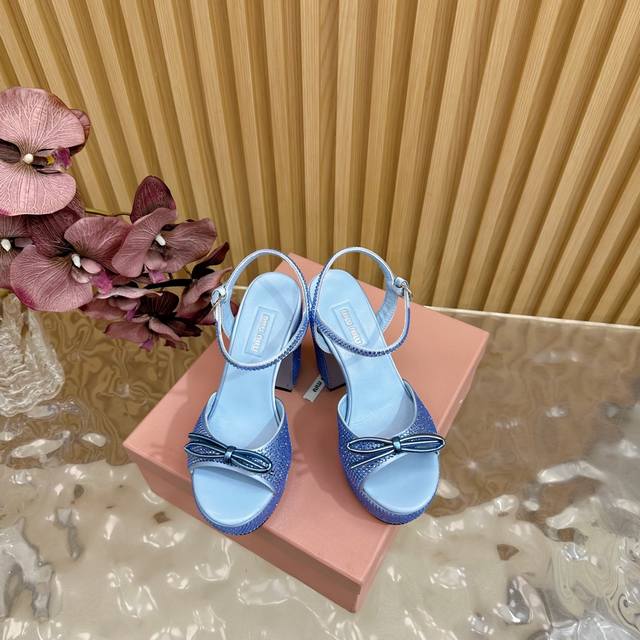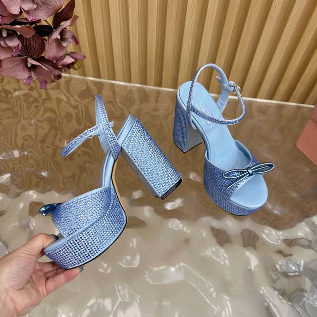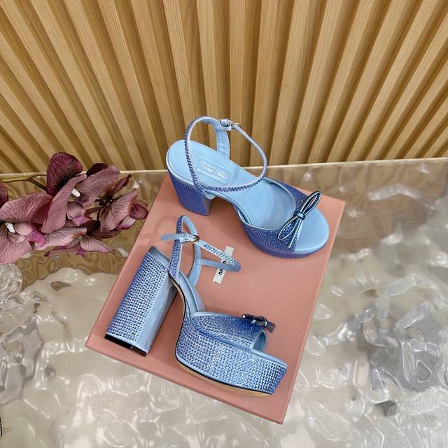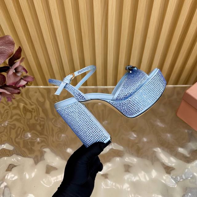 Miumiu 缪缪25S春夏新品防水台 粗跟凉鞋鞋跟镶满闪闪水滴钻太美了 鲜明的设计风格和独特的美感 极强的彰显着个性不羁的摩登态度 创作即外观线条优美流畅 又