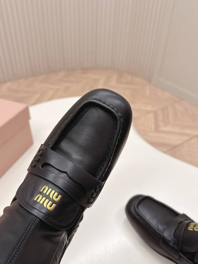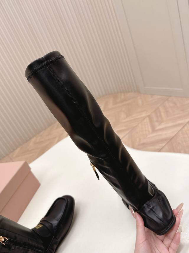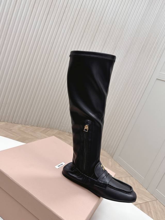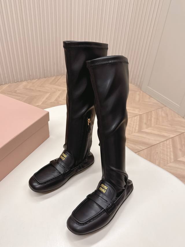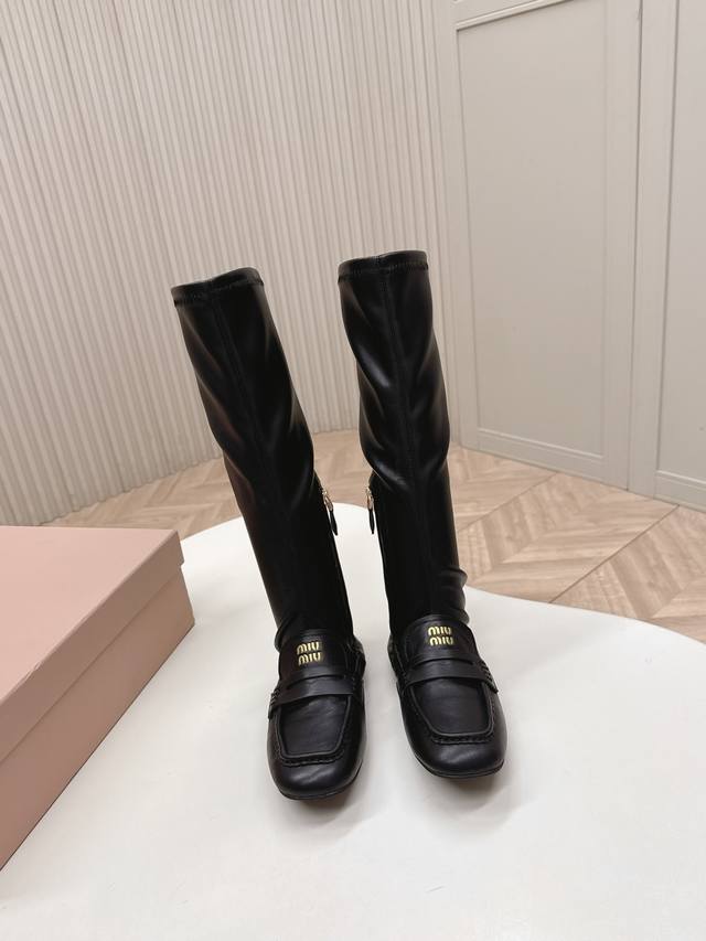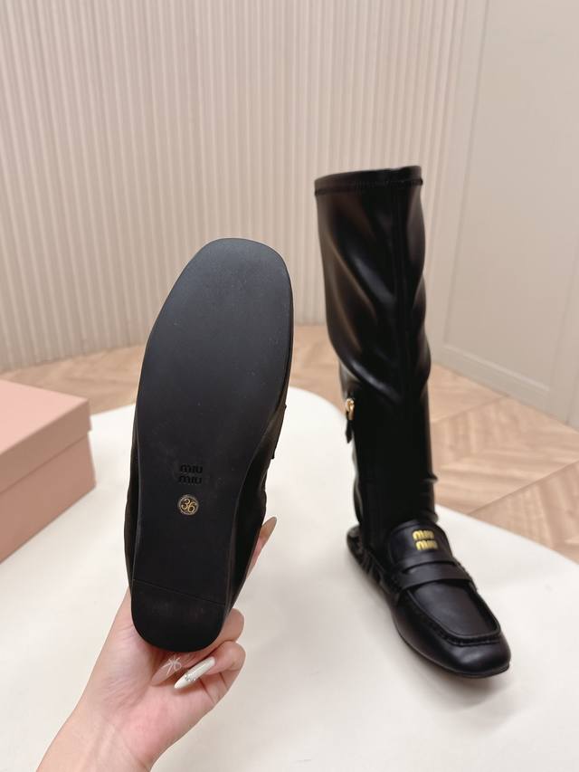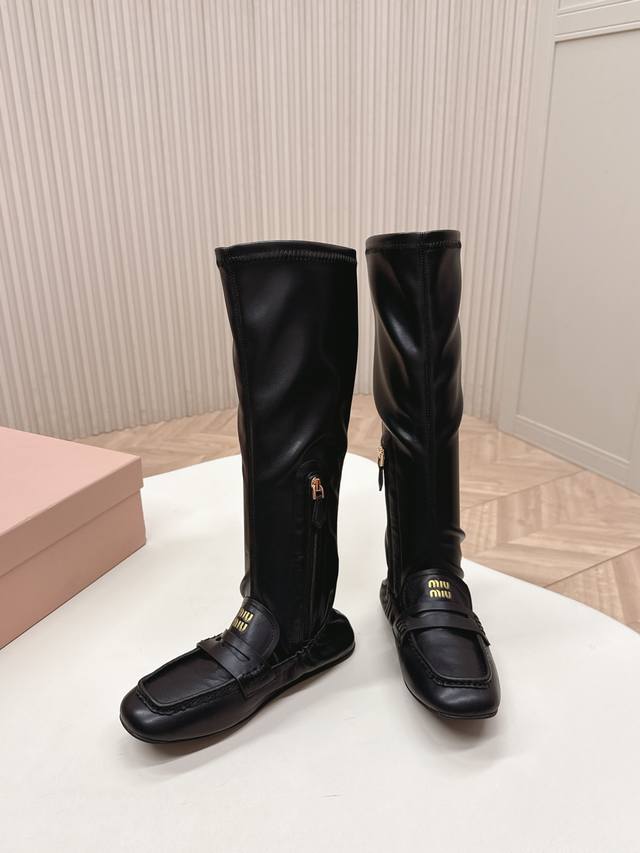 Miumiu 25新款高筒乐福拼接弹力靴皮靴 巨显瘦 大胆的拼接款式设计,未来感与经典碰撞 重构随性华美 充满活力、艺术、新鲜感风格随性的华美,这款鞋子上脚非常舒服,脚感很棒 靴筒弹力皮 鞋面牛皮 内里 羊皮 原版大底 码数:35-40