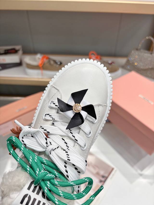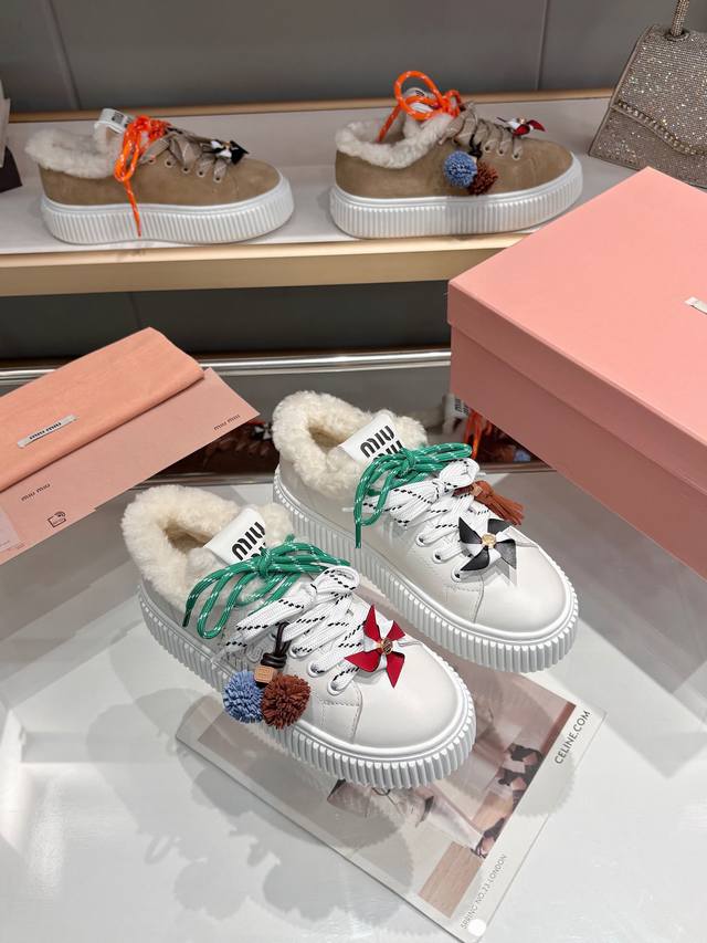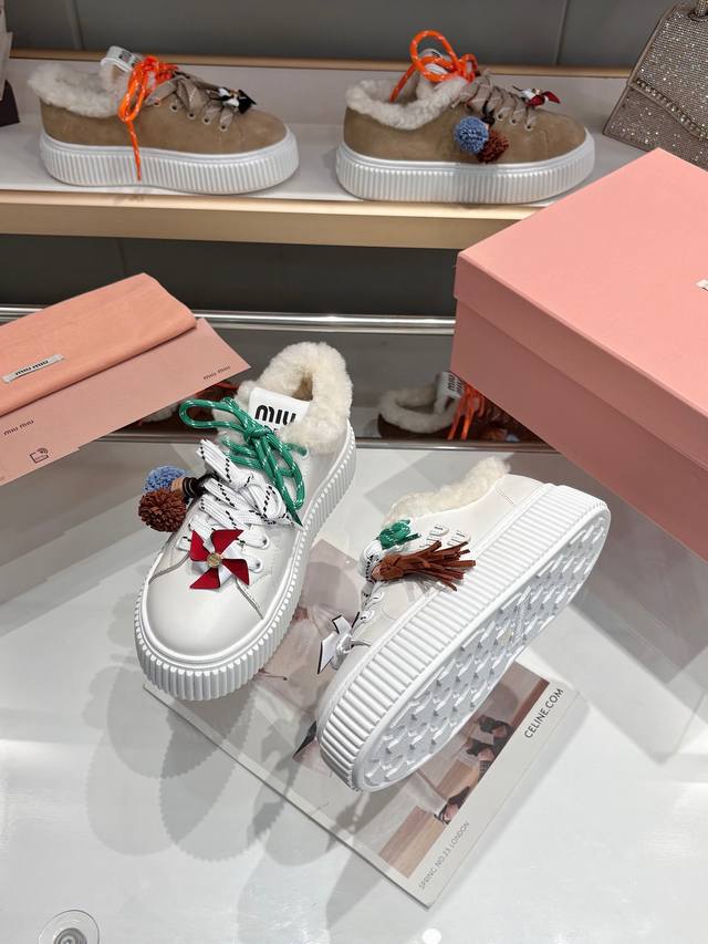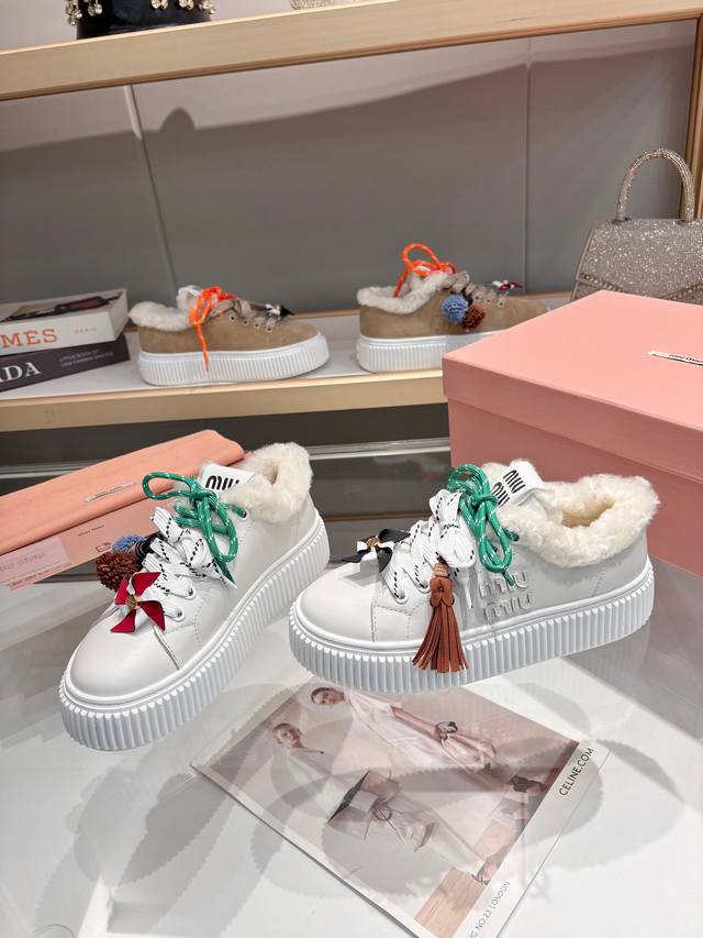 Miumiu 25Ss 秋冬新款 厚底 小白鞋 羊毛小白鞋 简约造型,超轻原版开模鞋底,脚感妥妥满分 好穿好搭,**6Cm 饼干鞋的热度真的是只增不减的 不仅因为其极高的配适性 也得益于其出众的脚感之鞋底一层层波浪就像饼干 一 般!颜值在线抗打而Miu家鞋款一向走的是少女范儿 没多少个女生能逃得过缪家的甜美!而这一次则是Miu家的饼千鞋系列4 虽说是简约的设计 但这个1Ogo鞋舌也极具辦识度!随意搭配长裙 短裙牛仔裤休闲系列等 都能穿出与众不同的风格减龄效果非常明豆中 鞋面:牛反绒 羊羔毛 内里:牛皮 大