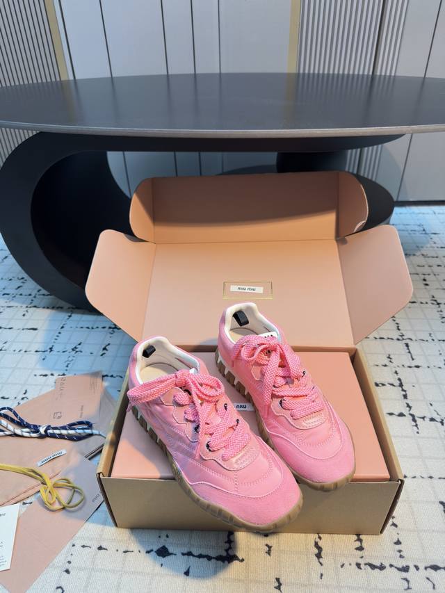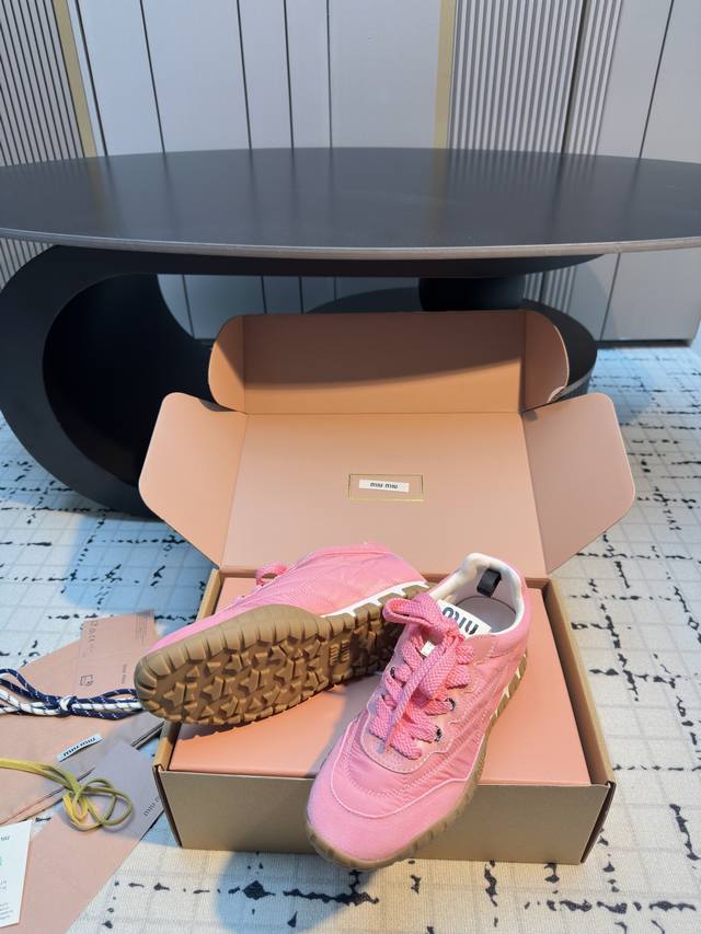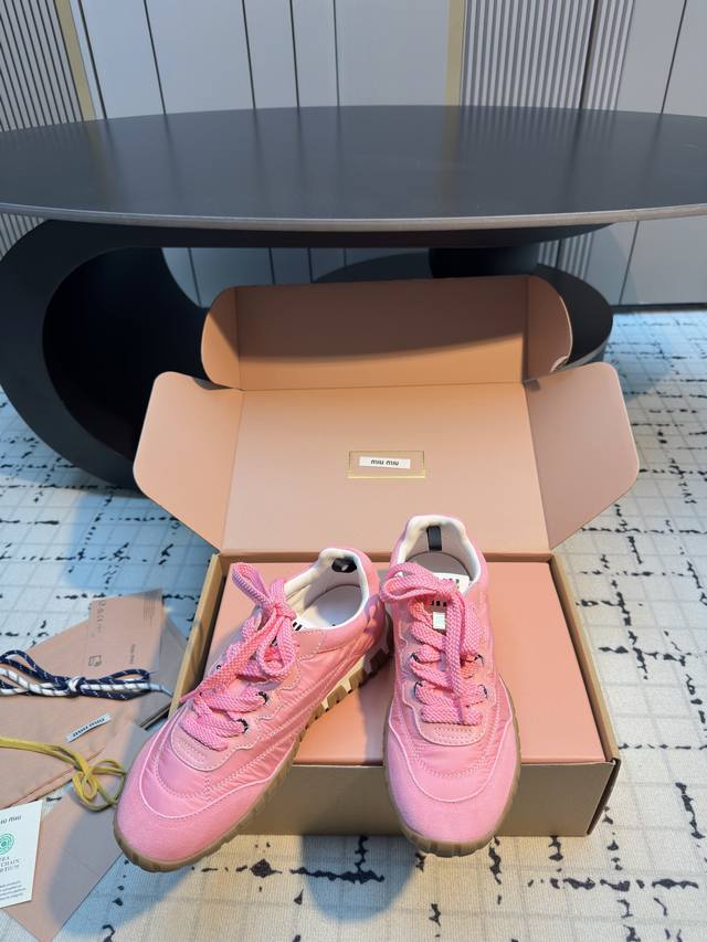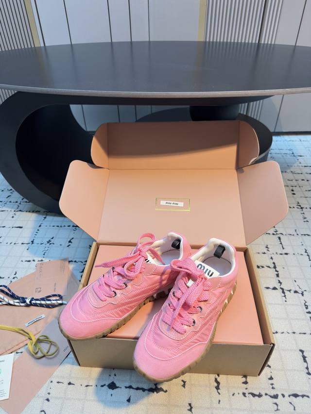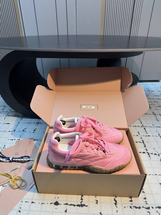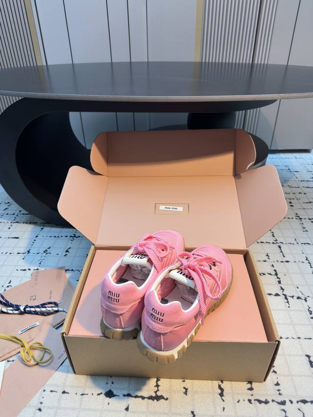 Miumiu25新品时髦复古舒适Tyre系列登山鞋德训鞋运动鞋! DDD 今年王炸爆款!必荐款! DDD 今年真的被Miumiu拿捏了..... DDD 步入运动鞋的新纪元,Tyre系列鞋履是优雅与功能的终极幻想!动感橡胶鞋底,灵感源自轮胎的深刻纹理,每一步都稳健而富有弹性,仿佛在城市脉络中疾驰,留下独特的时尚轨迹。鞋面采用高级织物与绒面皮革交织,质感与格调并存,彰显Miu Miu无畏的前卫精神。 DDD 充满青春时髦的气息!复古与时尚的结合,甜酷甜酷的舒适休闲穿搭低调的奢华于细微处流露,穿上它展现你的个