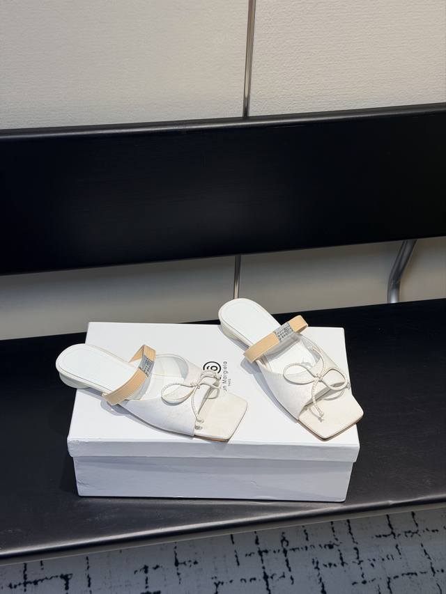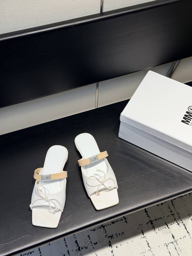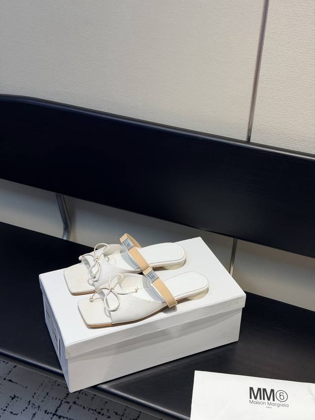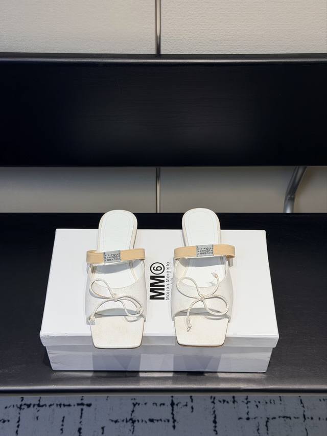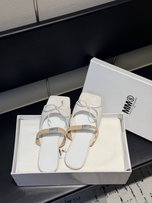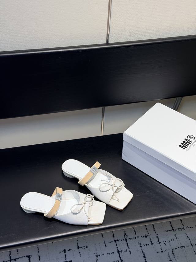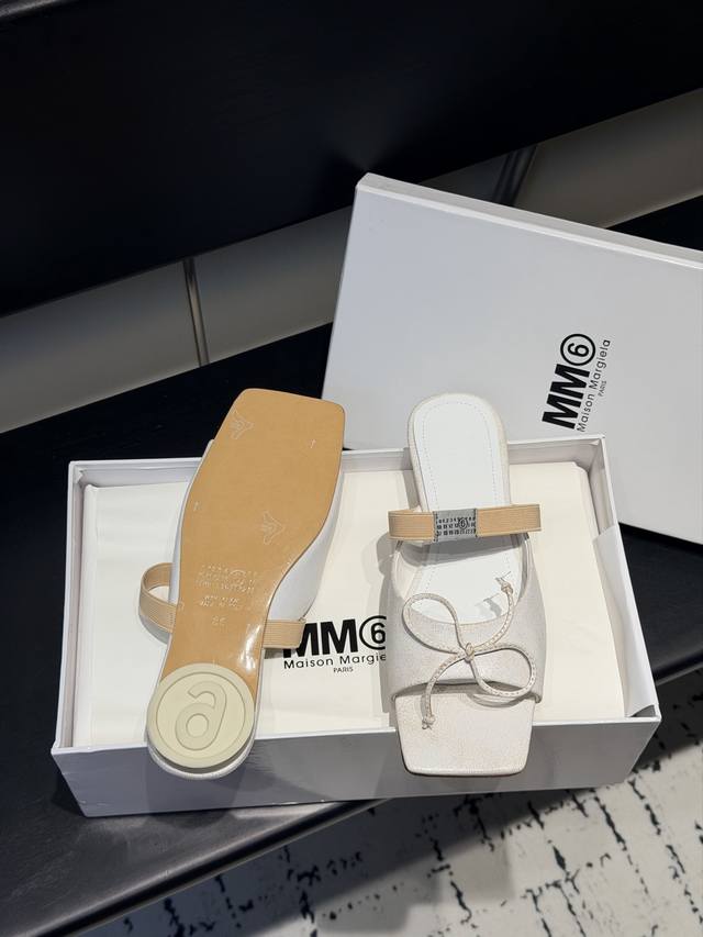 FFF Mm6、 26春夏款复古方头弹力带芭蕾鞋高跟鞋凉鞋系列 DDD 采用品牌标志性的贴合脚型的雕塑感轮廓,鞋面柔软且线条流畅,兼顾贴合度与设计感。方头+芭蕾元素融合:经典方头设计打造现代感,搭配鞋面蝴蝶结装饰,重构芭蕾鞋的优雅轮廓,同时做穆勒拖的后空款式,兼具休闲与精致。 DDD 鞋后跟处有标志性的白色单线缝线,鞋身弹性带带有Mm6数字标识,是品牌辨识度的关键。后空的穆勒拖结构,简化穿脱方式,将芭蕾鞋的柔美与穆勒鞋的随性结合。 DDD 鞋面:复古爆裂牛皮 DDD 内里:丝绸羊皮里 DDD 大底:真皮大