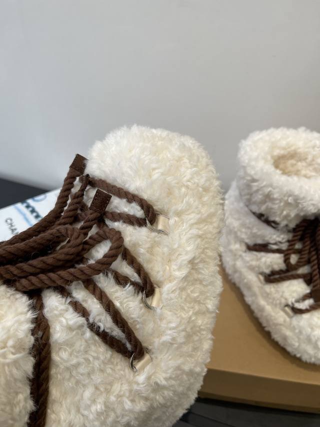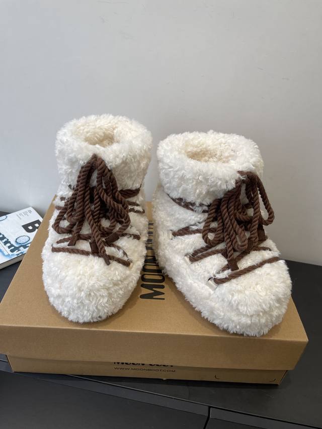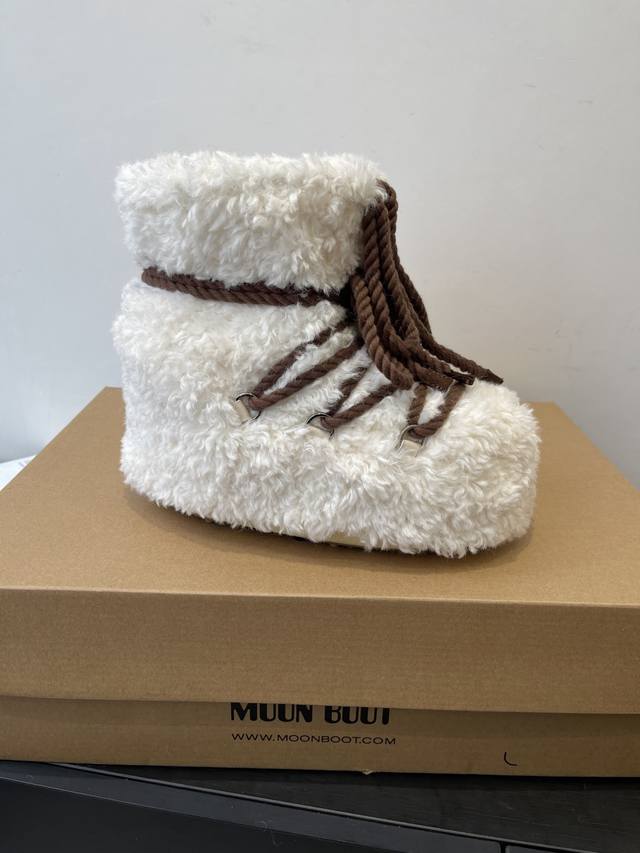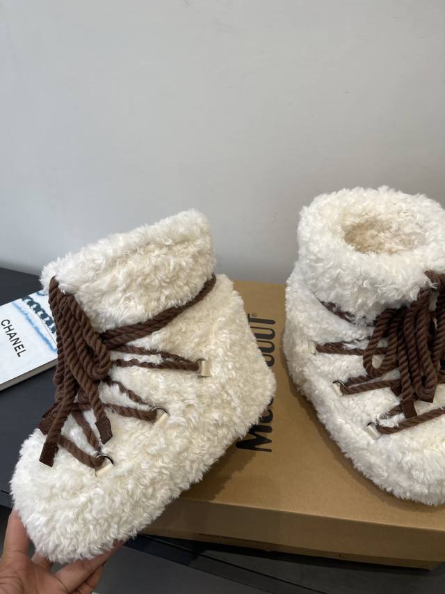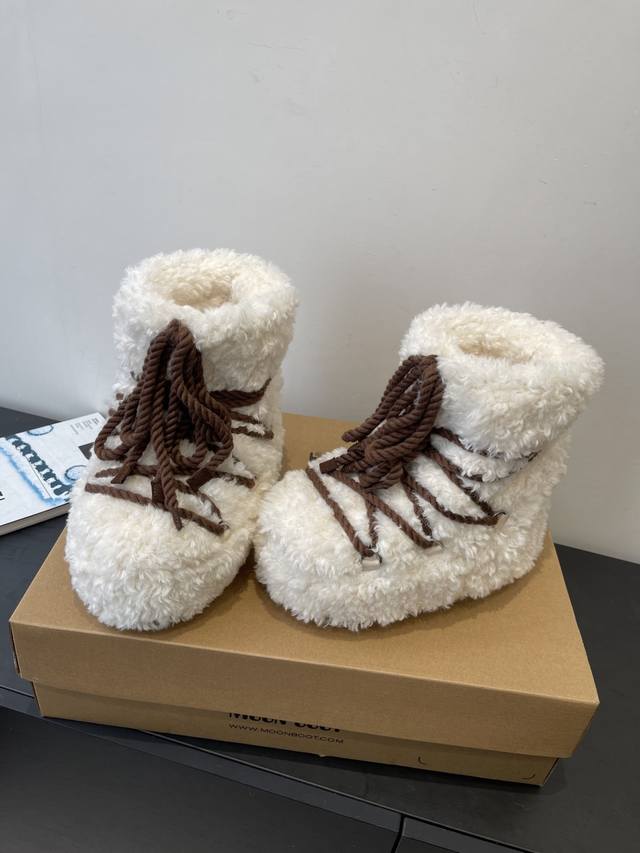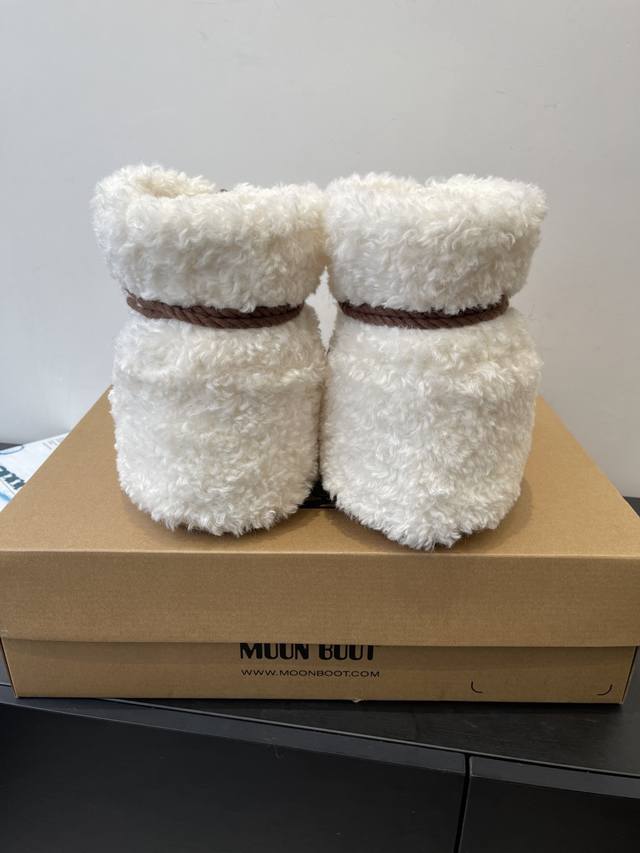 Moon Boot 秋冬最新款雪地靴 丑萌滑雪鞋 DDD 超多明星网红种草 秋冬滑雪必备款 现在有一款更另类的雪地靴又杀回来了 内增高5Cm那就是Moon Boot月亮靴在千禧年就已经非常火了 当年paris Hilton、Victoria Beckham 等名人经常穿它 如今Y2K风潮再次流行 万人大秀的丑萌雪地靴重新翻红 不分男女不分左右 看着巨无霸巨显瘦还暖和好穿 DDD 鞋面原版羊卷毛 DDD 内里垫脚 100%丝绵内胆 DDD 内增高4Cm DDD 原版热塑性橡胶大底 DDD 码数:35-39