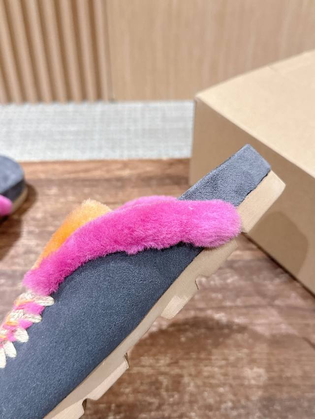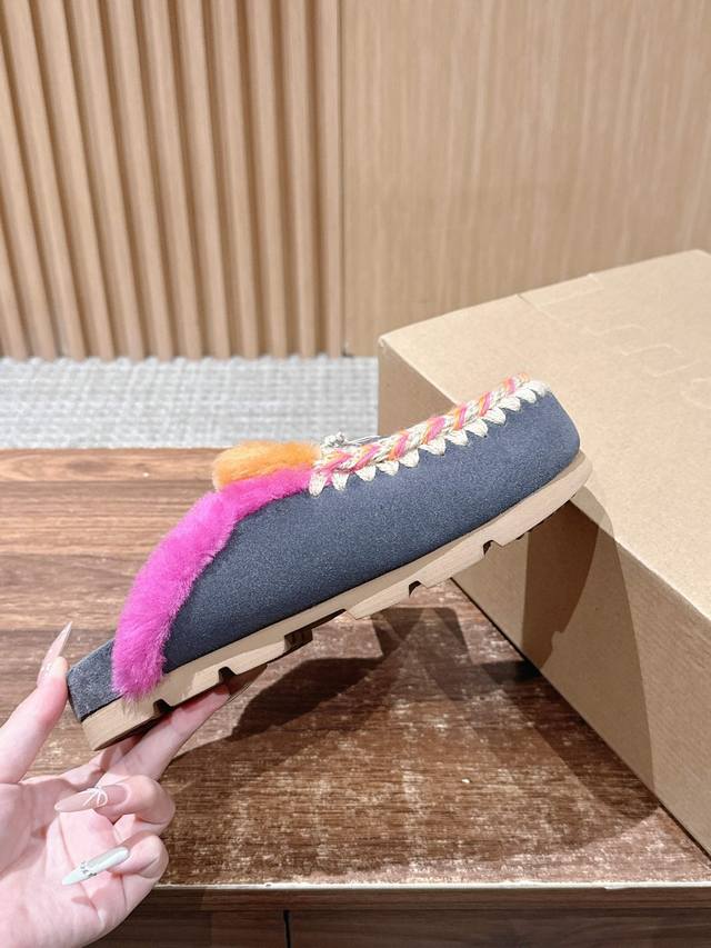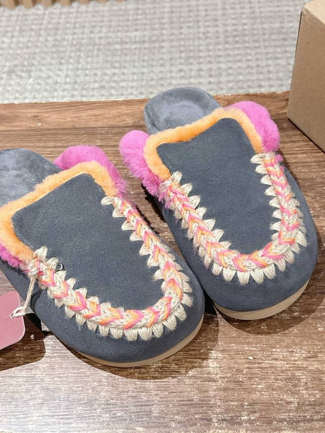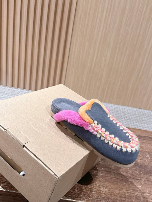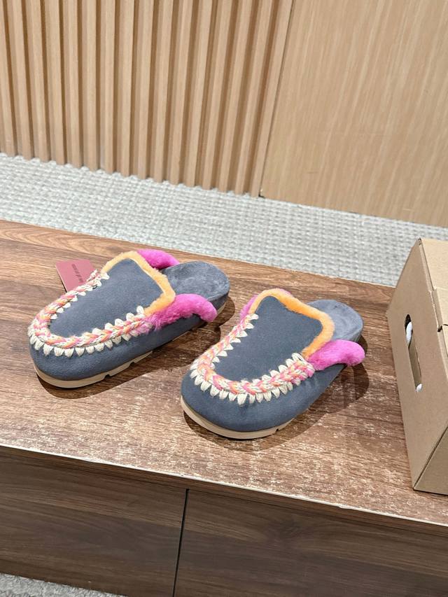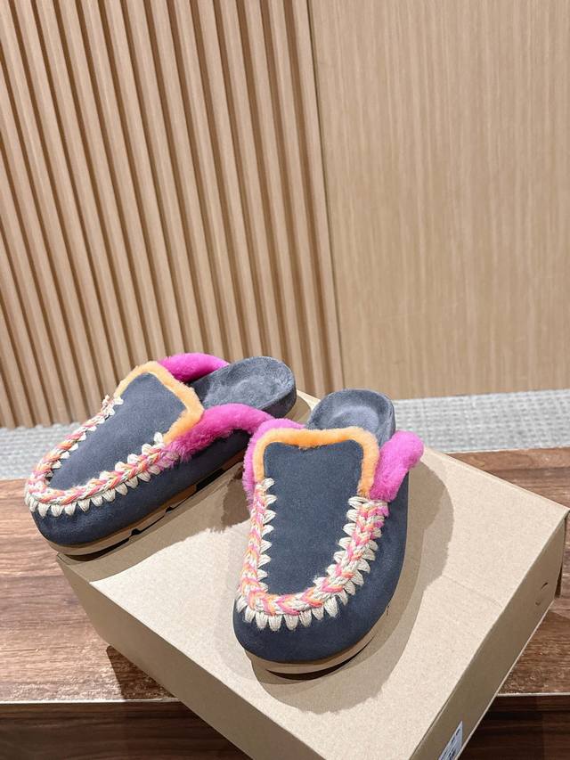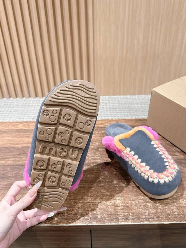 Mou 小众潮牌秋冬新品 博肯 毛拖 居家不失舒适与精致一双弹力厚底羊毛拖鞋慵懒而温暖 脚掌如同陷入了轻柔的拥抱中柔软的羊皮毛一体皮料结合无论外出还是居家 让冬季充满美拉德浪漫 鞋面:麂皮鞋面 重工民族风手工衍边 内里垫脚:羊毛 鞋底:原版软橡胶大底 Size:35-39 40.41定做不退换