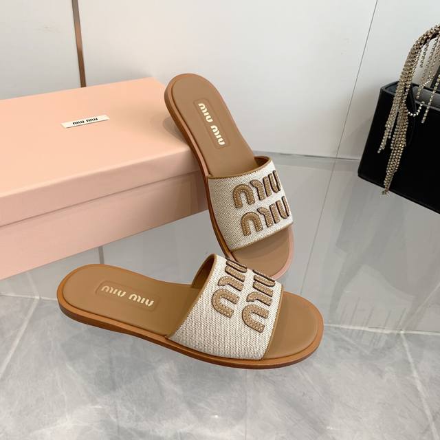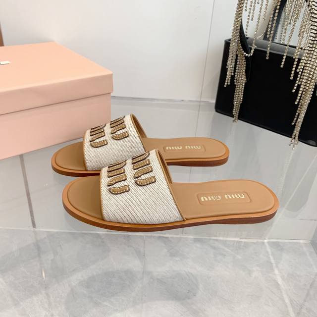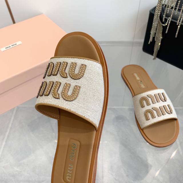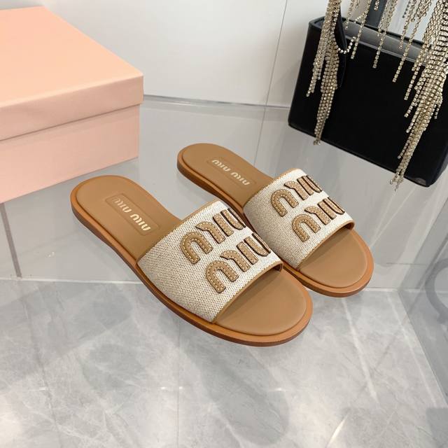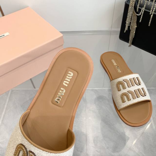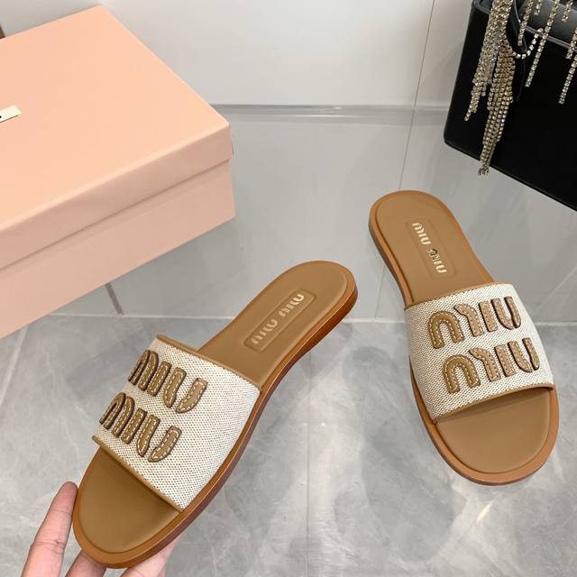 Miu Miu2025春夏系列拉菲草编织皮质Logo半拖 Zp开发