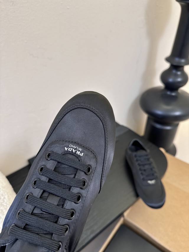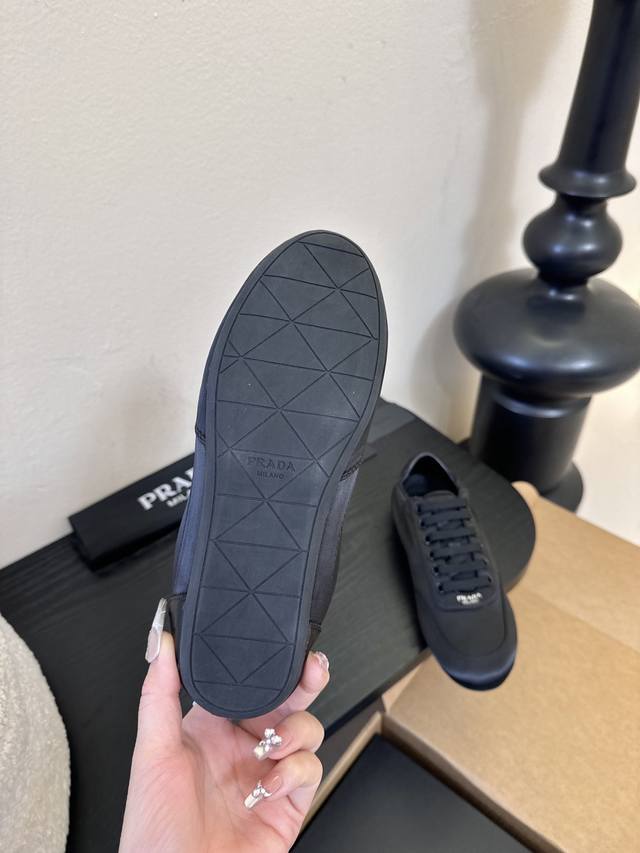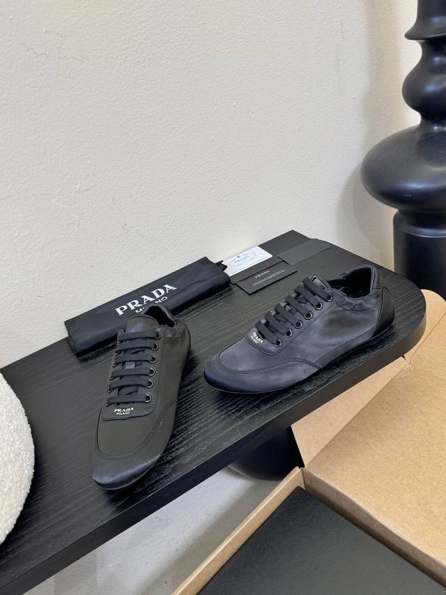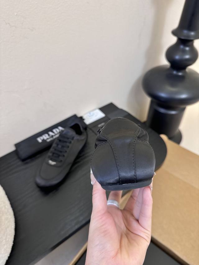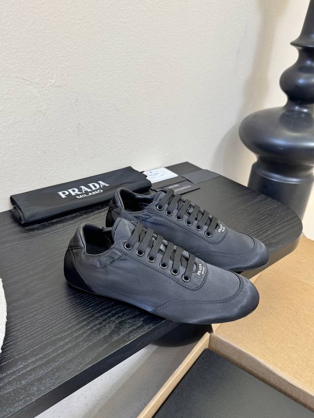 prad**经典款运动鞋复古德训鞋休闲鞋 DDD 采用复古德训鞋的低帮流线型廓形,鞋头为尖圆头设计,整体线条利落简约;鞋舌处印有prada经典Logo,鞋带与鞋身同色呼应,细节处强化品牌辨识度;鞋型为窄楦设计,贴合脚型更显利落。 DDD 鞋面使用光滑的尼龙缎面 亮面皮革材质,触感细腻且带有微光泽感;鞋身无多余装饰,靠一体成型的鞋型塑造立体感;鞋底为轻质橡胶材质,兼顾柔软度与耐磨性,适配日常穿着。 DDD 鞋面:真丝布 Ddd 内里:羊皮 布 Ddd 大底:橡胶大底 Ddd 增高:2Cm Ddd Size: