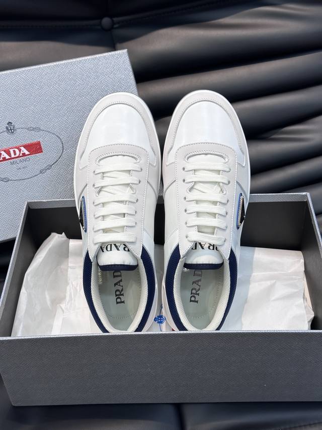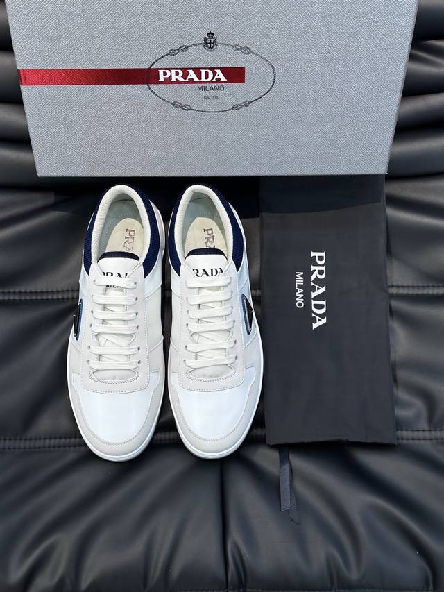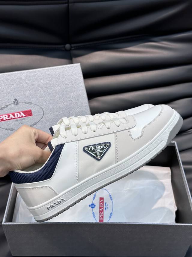 prad* 新品男士系带皮革休闲运动鞋,头层牛皮拼接透气帆布面料,非常有质感,重工打造,三角形品牌徽标点缀鞋身,头层羊皮内里.防滑减震花纹轻质厚底,实物和上脚更