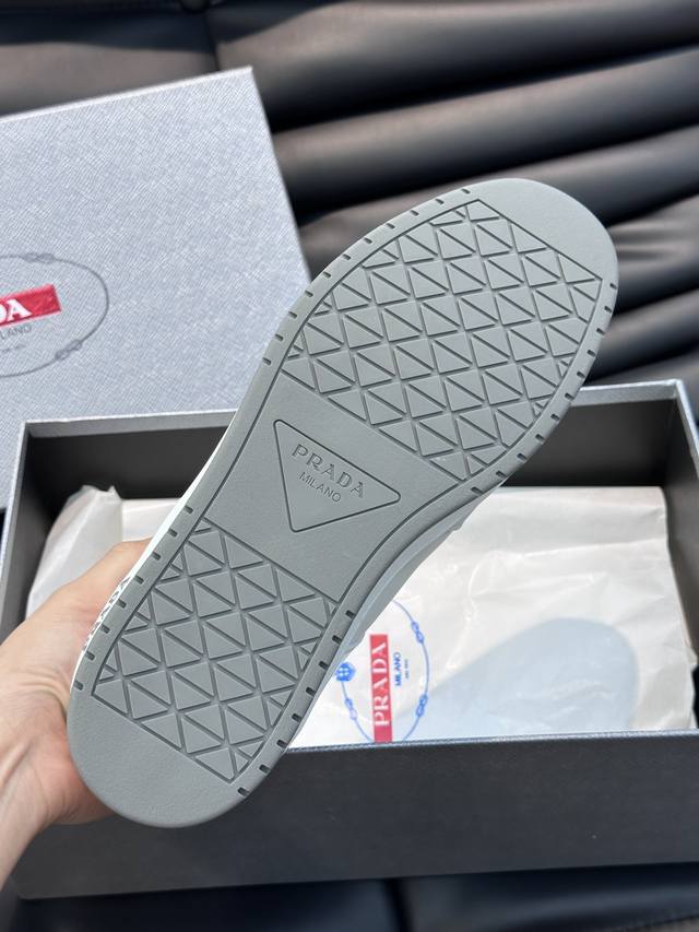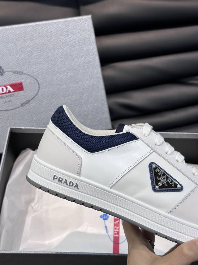 / prad* 新品男士系带皮革休闲运动鞋,头层牛皮拼接透气帆布面料,非常有质感,重工打造,三角形品牌徽标点缀鞋身,头层羊皮内里.防滑减震花纹轻质厚底,实物和上脚更
