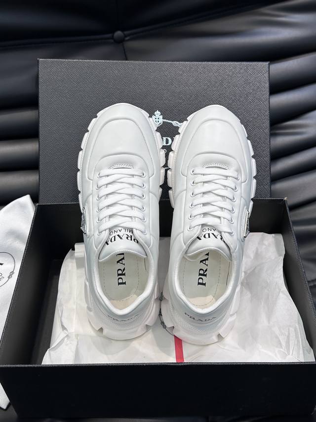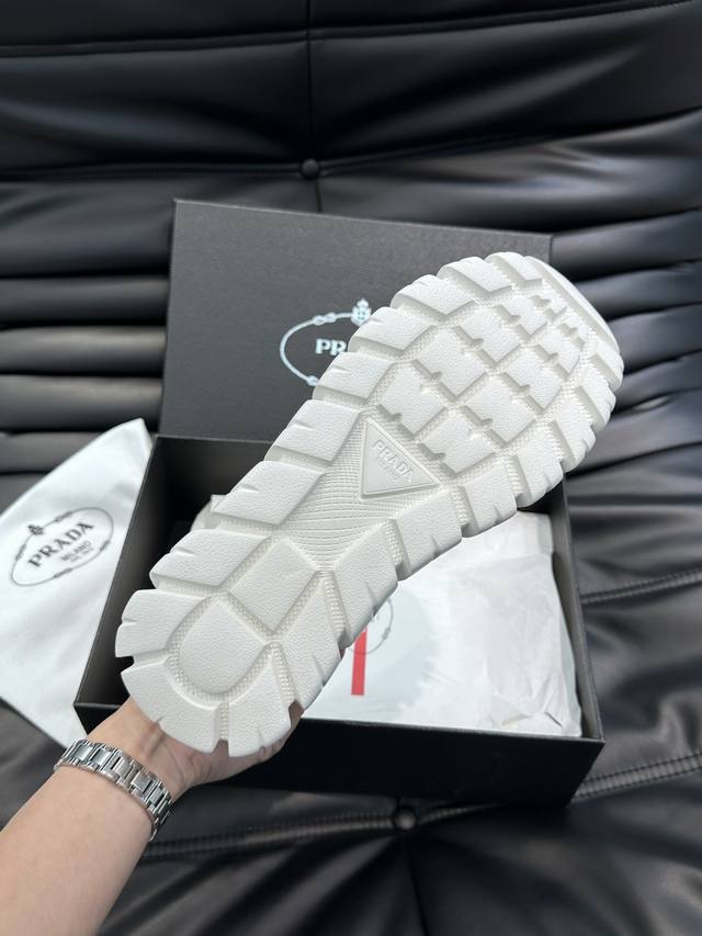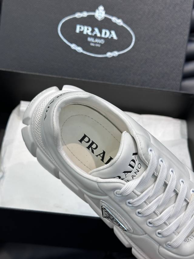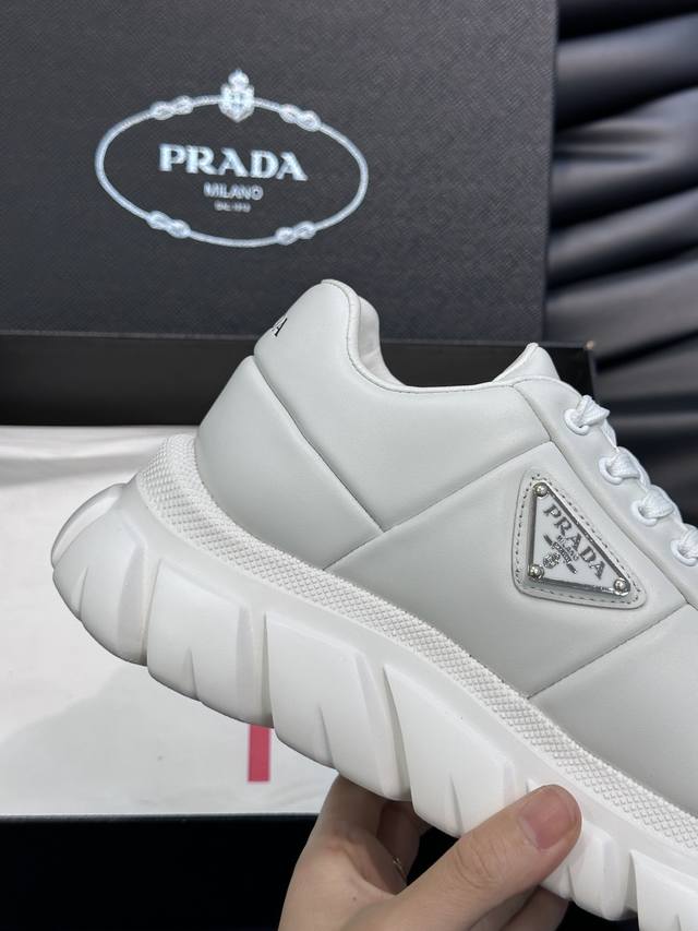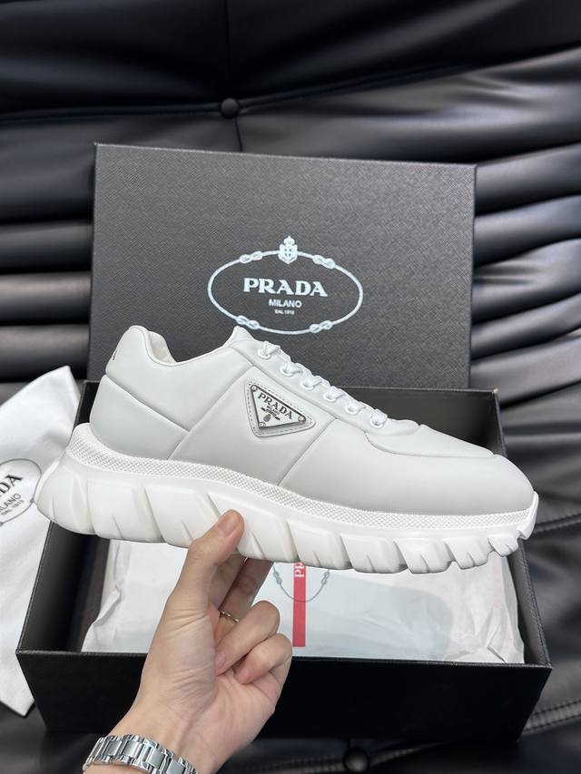prad* 男士新款柔软皮革休闲运动鞋,这款运动鞋采用纳帕牛皮打造,皮质柔软细腻,纹理自然,提升透气性能,外侧涂珐琅金属三角形徽标点缀鞋身,鞋舌及后跟饰以品牌字母Logo细节,超轻质6Cm凹凸纹橡胶厚底,侧面配有prad*字母徽标,羊皮内里,脚感舒适,精致百搭!Size:38-44 DDD Ddd