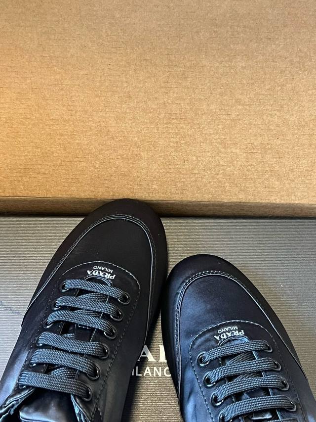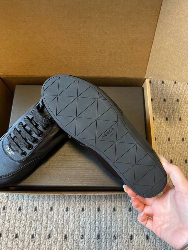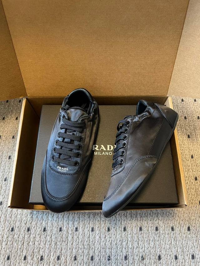 prada 经典款运动鞋复古德训鞋休闲鞋 DDD 采用复古德训鞋的低帮流线型廓形,鞋头为尖圆头设计,整体线条利落简约;鞋舌处印有prada经典Logo,鞋带与鞋身同色呼应,细节处强化品牌辨识度;鞋型为窄楦设计,贴合脚型更显利落。 DDD 鞋面使用光滑的尼龙缎面 亮面皮革材质,触感细腻且带有微光泽感;鞋身无多余装饰,靠一体成型的鞋型塑造立体感;鞋底为轻质橡胶材质,兼顾柔软度与耐磨性,适配日常穿着。 DDD 鞋面:真丝布 Ddd 内里:羊皮 布 Ddd 大底:橡胶大底 Ddd 增高:2Cm Ddd Size: