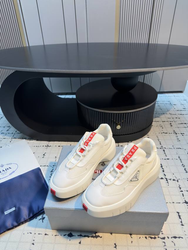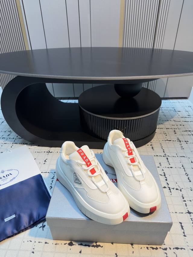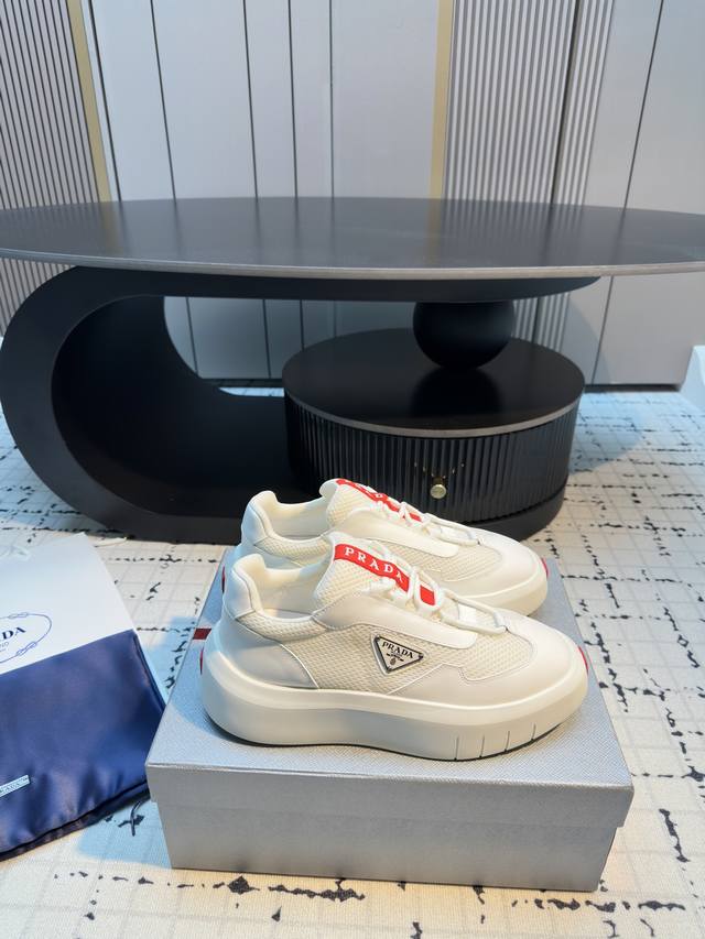 prada 25Ss春夏情侣款 厚底小白鞋 进口开边珠牛皮 进口小牛皮细节感跟好 三角标点缀,简单高级! 关键上脚超显腿长,轻松拉长腿部显腿! 女款:35 40