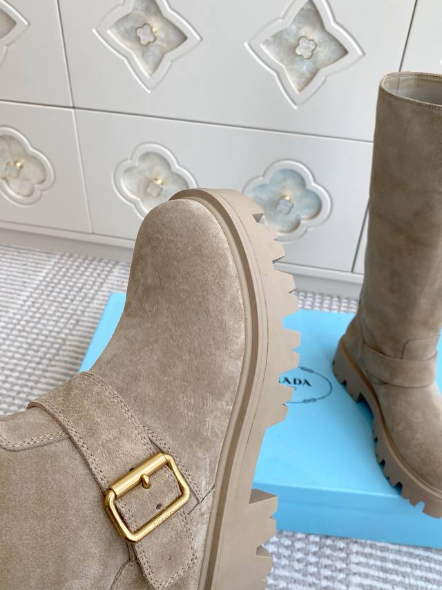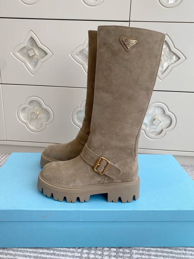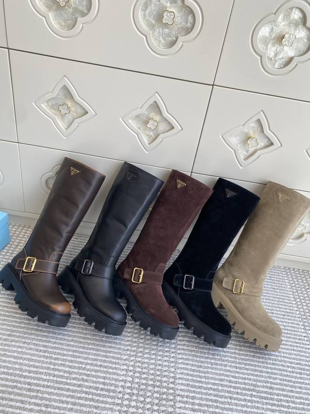 prada 25Ss 复古骑士厚底长靴,一脚蹬的懒人设计,奢适与松弛并存。 DDD 鞋身选用细腻头层牛皮,光泽自然,做工精准,每一寸都写着 高级 。金属扣带点缀,复古与硬朗悄然平衡,靴型立体中筒,默默修饰腿型,穿上即显瘦。 DDD 黑色款配黑皮衣+紧身裤,机车酷感拉满;深棕款搭卡其风衣与直筒裤,通勤也能穿出时髦气场。内里全皮,每一步都踏在质感之上。 DDD #prada新品 #高级感穿搭 #骑士靴 #懒人靴也能这么飒 DDD 鞋面:牛皮 DDD 内里:牛皮 DDD 鞋底: 原版开模橡胶大底 DDD Siz
