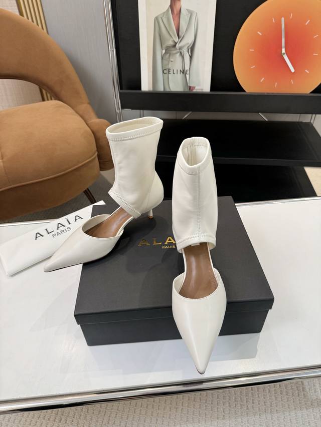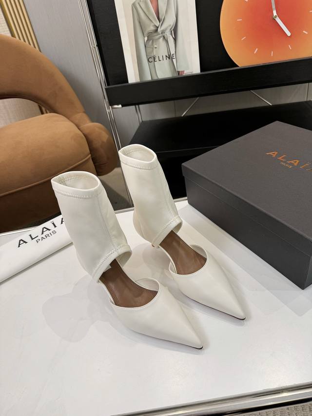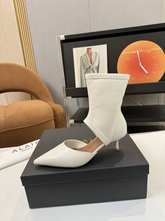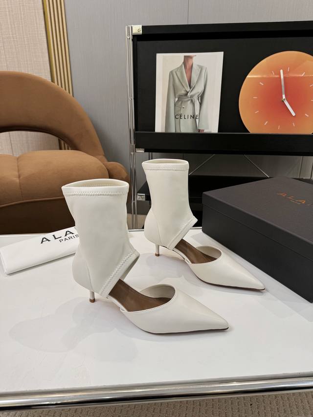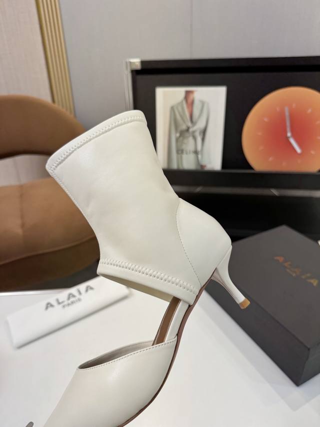 Price: 品 牌:Alaia 阿莱亚25新款箭头弹力短靴中空凉鞋 该款尖头踝靴,采用几何镂空露肤设计,搭配55毫米鞋跟,更加拉长腿部线条比例; 弹力绒面皮山