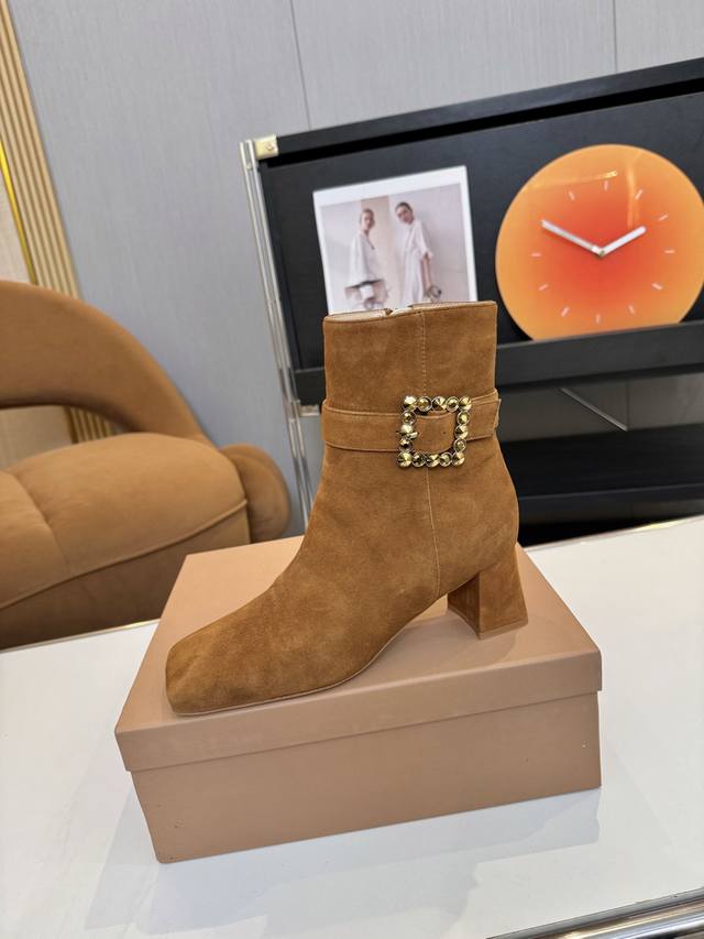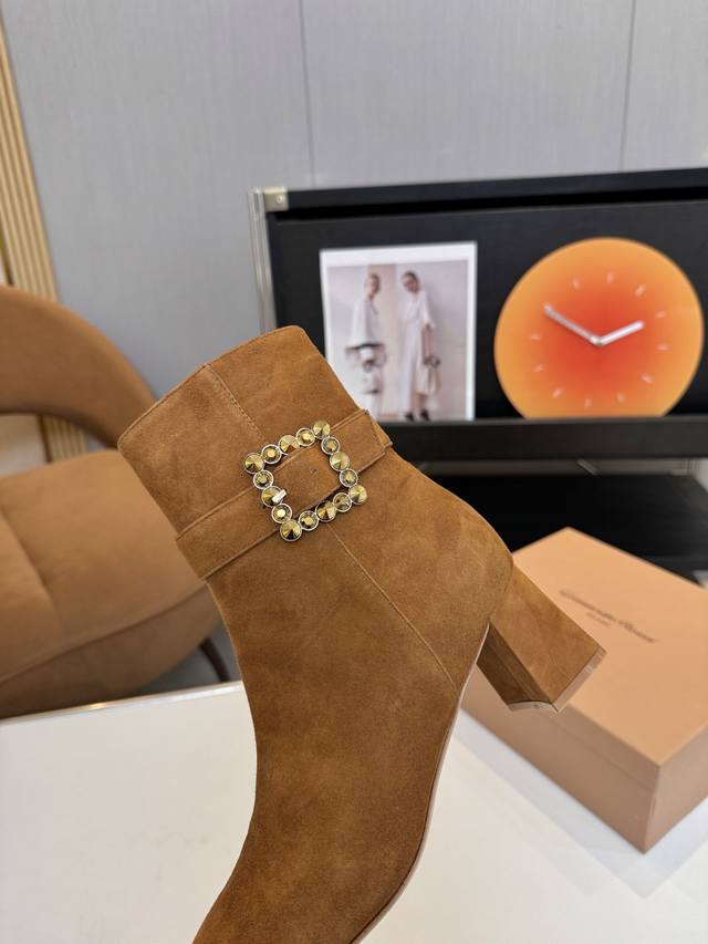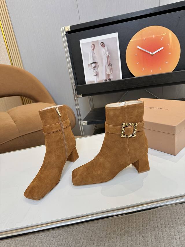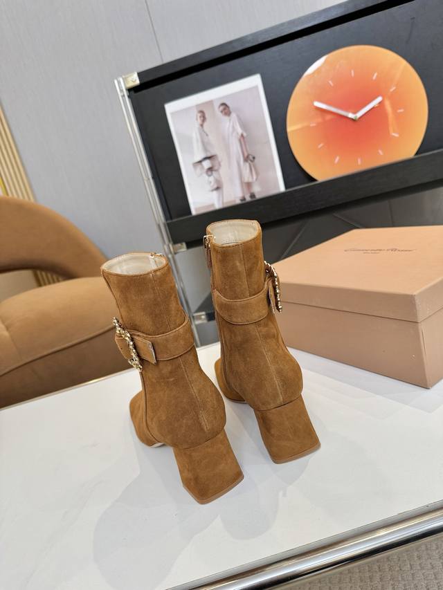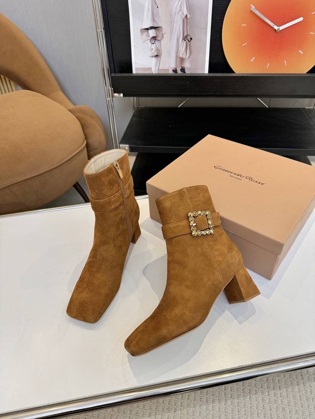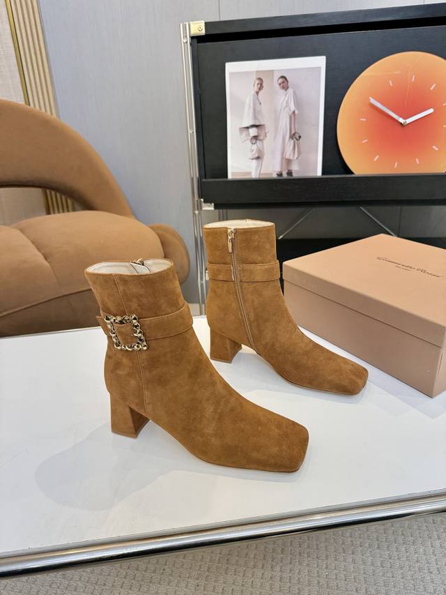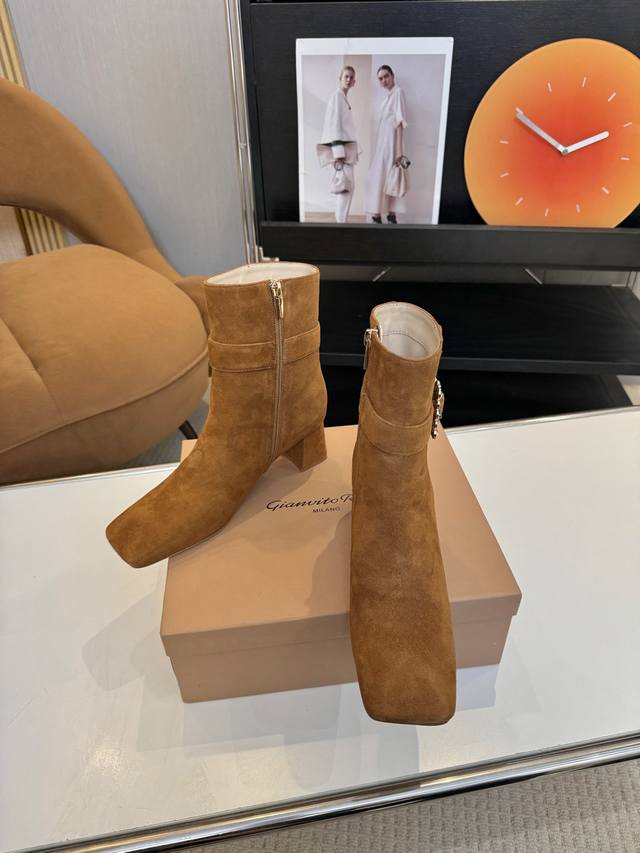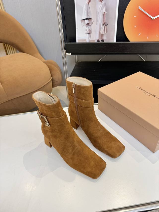 Price: 品 牌:Gianvito Rossi 25S秋冬新款 罗西 Gr方头及踝靴侧拉链R扣粗跟短靴。 鞋面采用绒面革,质感柔软细腻,自带奢华高级感,同时为整体造型增添了一份复古优雅气质。 经典的尖头设计,能自然拉长腿部线条,修饰脚型,是永不过时的“显腿长”利器;鞋筒高度适中,属于踝靴范畴,适配多种裤装 如牛仔裤、小黑裤 或裙装 如连衣裙、半身裙 ,穿搭场景广泛。 鞋身侧面有一条 横饰带,饰带上点缀着品牌标志性的 金属扣环‘R’元素变体,常以金属配件提升奢华感,为简约的靴身增添了精致细节与辨识度。