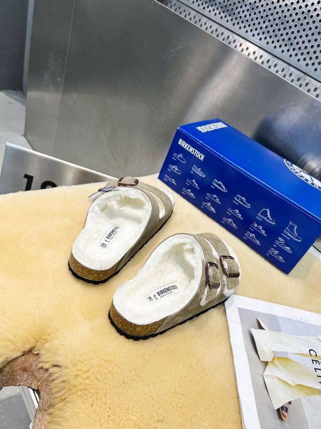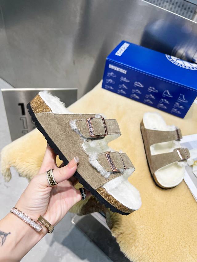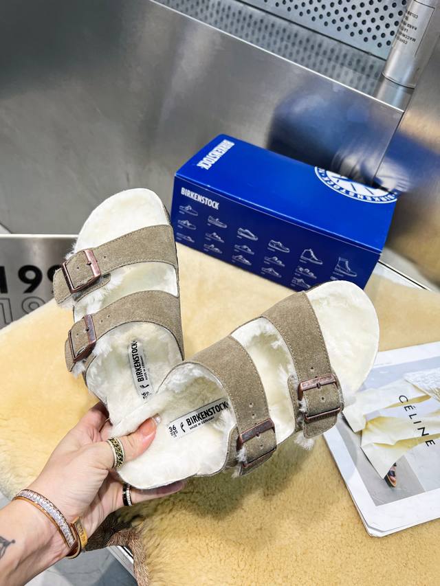 r 勃肯 22秋冬 最新 羊毛皮带拖 面料:进口丝光牛皮反绒 内里:澳洲羊毛 垫脚:增高澳洲羊毛 大底:超轻EVA发泡大底环保可循环木屑水台 码数:35~40#