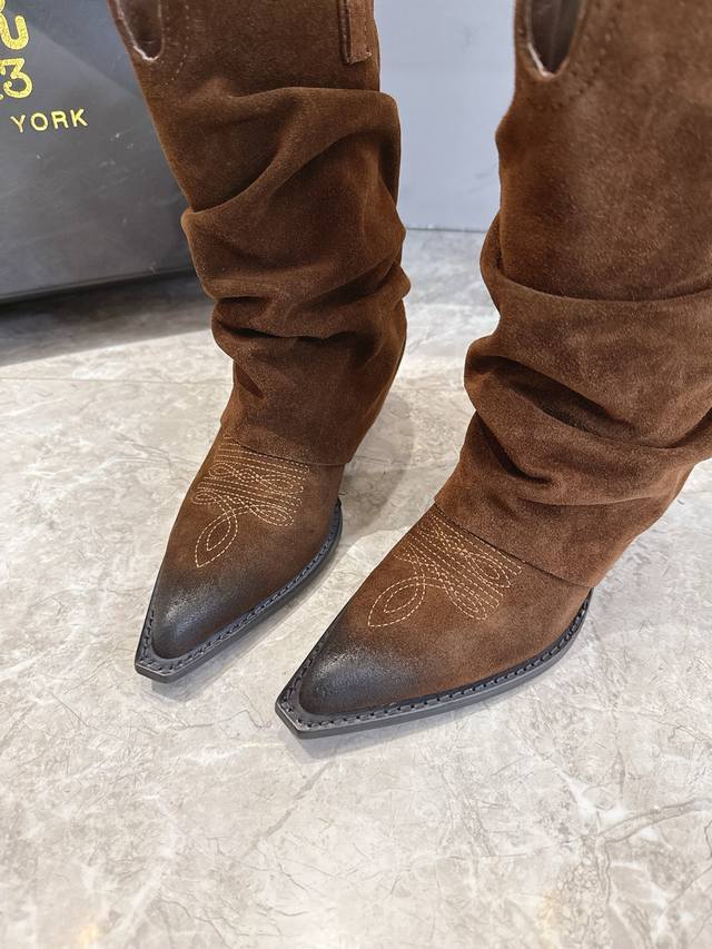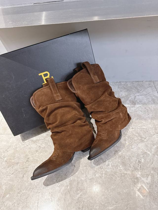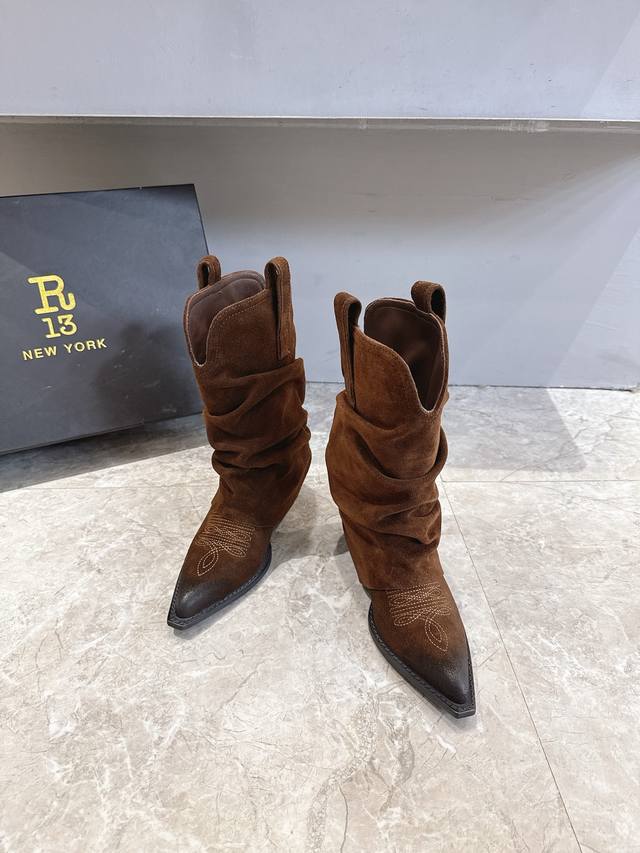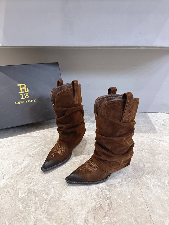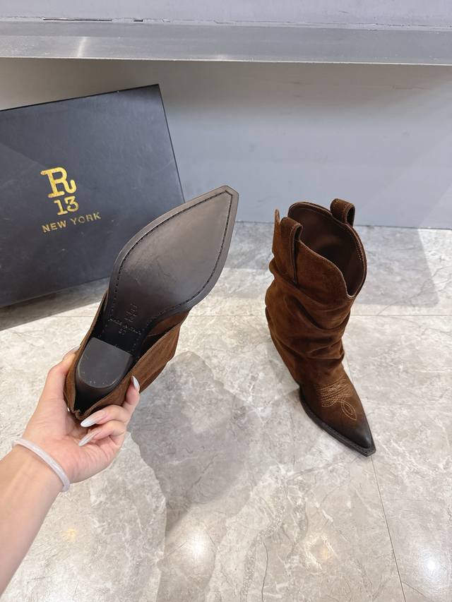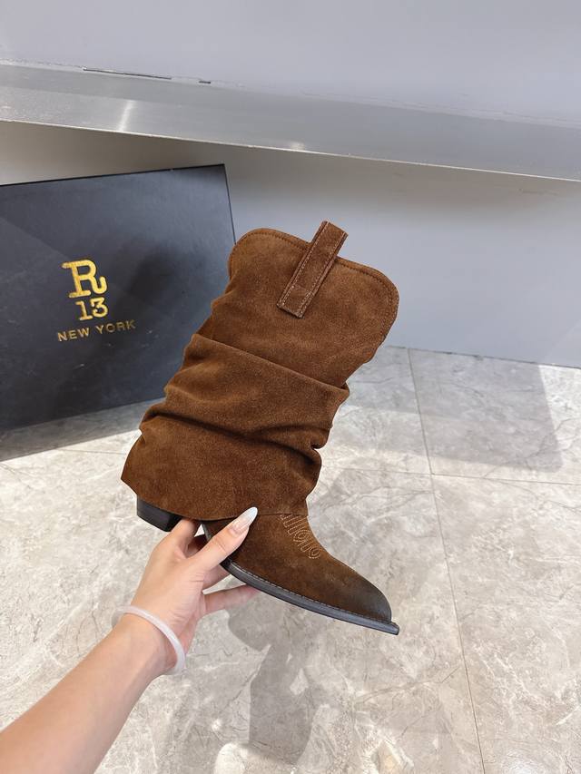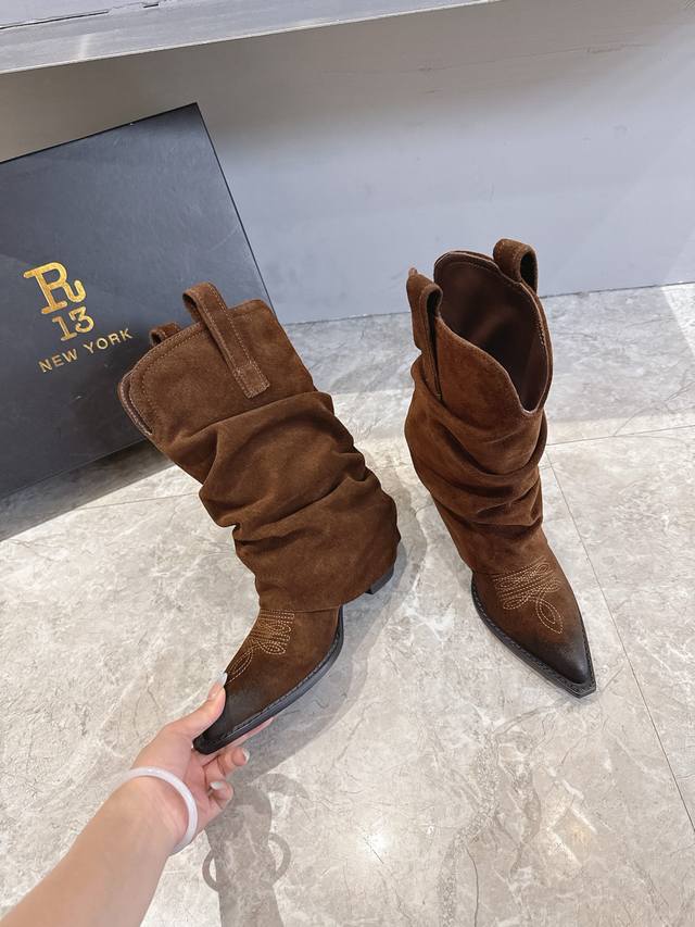 / R13 新品R13 这款西部靴 复古麂皮褶皱设计超吸睛 尖头造型拽酷拉满 上脚瞬间化身街头时髦精 轻松拿捏美式复古腔调~鞋面:进口麂皮 内里:进口牛皮 大底:进