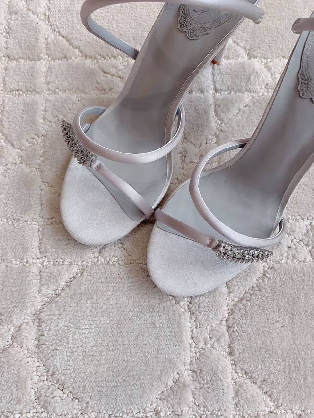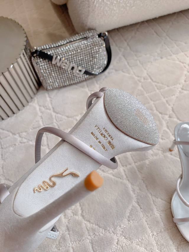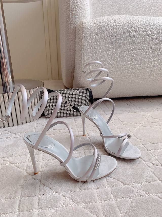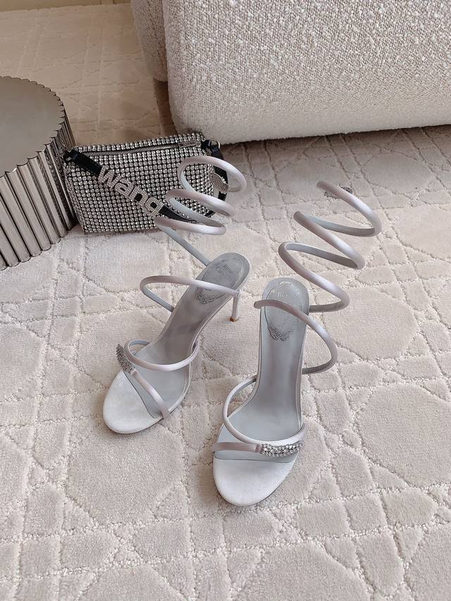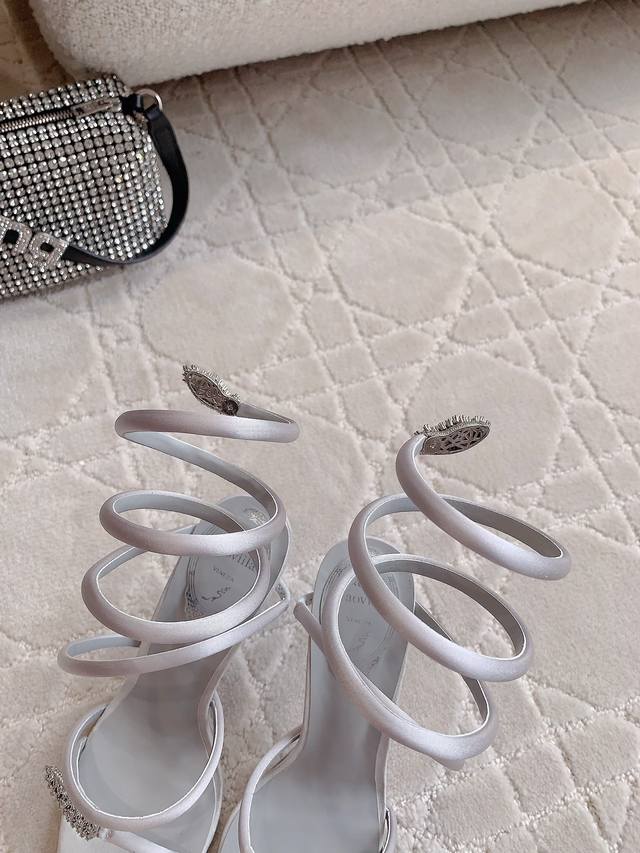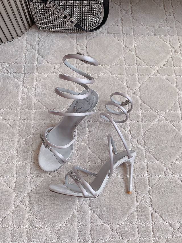 Ren* Caovill*新款蛇形水钻高跟凉鞋 永远仙气十足的蛇形带环绕脚踝 精致闪耀 展现独特的细节与耀眼的印记~~ 鞋面真丝 内里垫脚羊皮 意大利真皮大底
