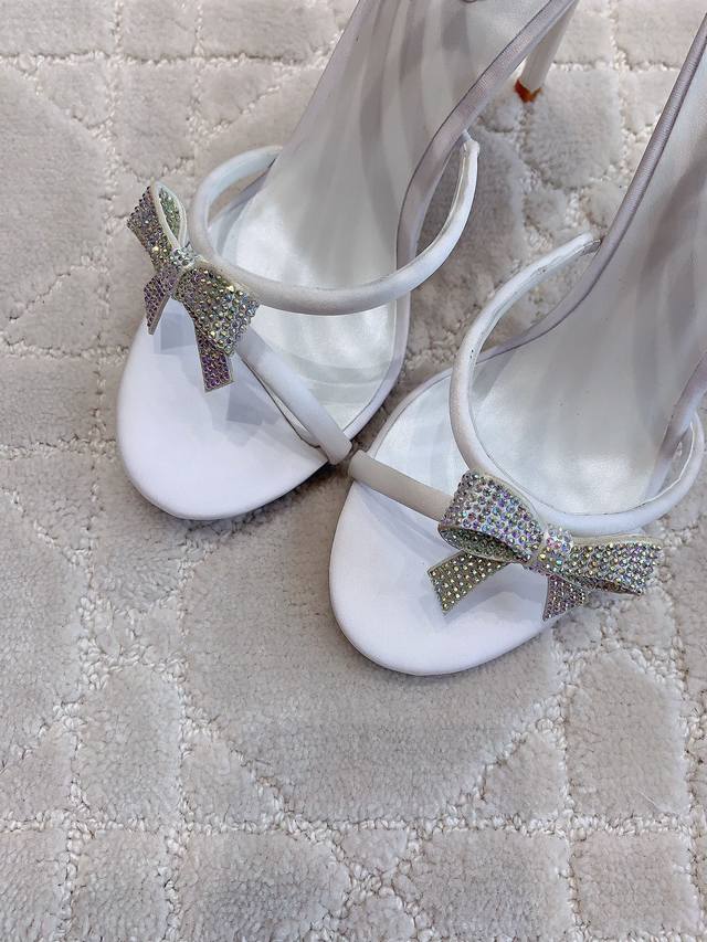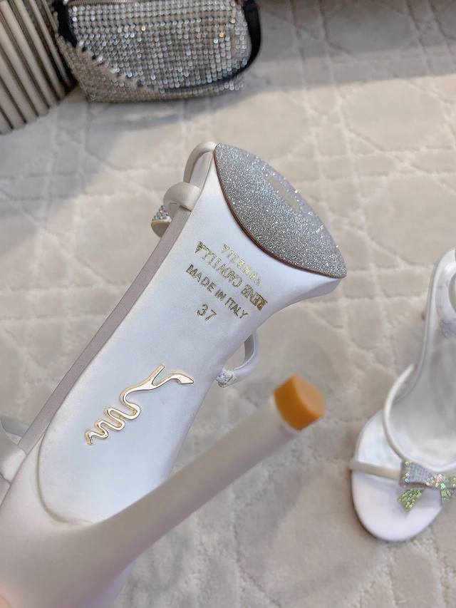 Ren* Caovill* 经典蛇形缠绕水钻镶嵌高跟凉鞋 水钻蝴蝶结点缀增加甜美气息 鞋面真丝 搭配超闪水钻 内里垫脚羊皮 原版一致闪银真皮大底 跟高:9Cm