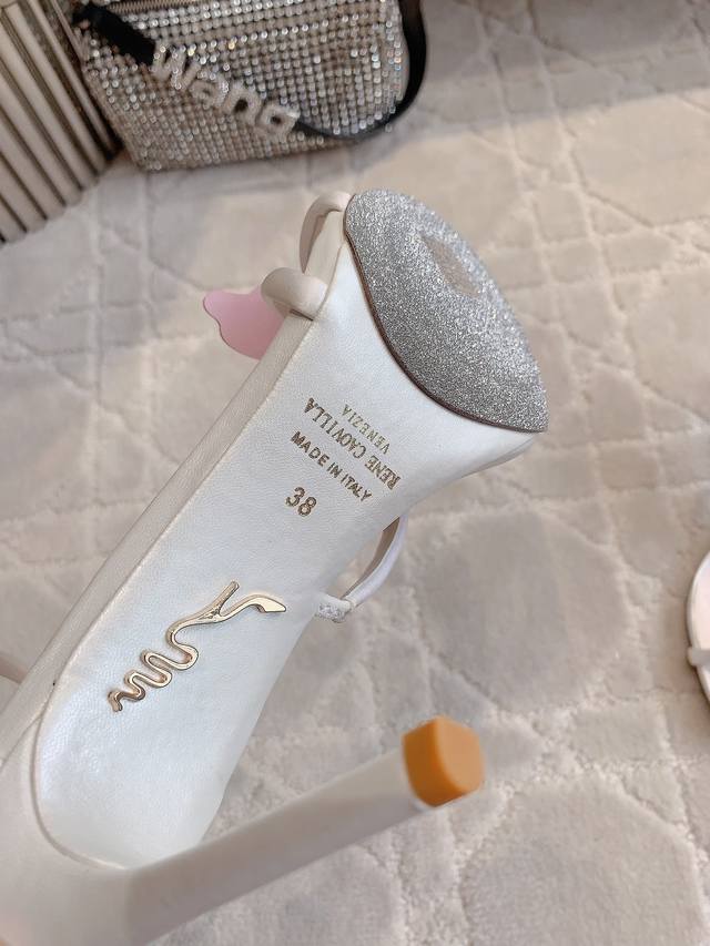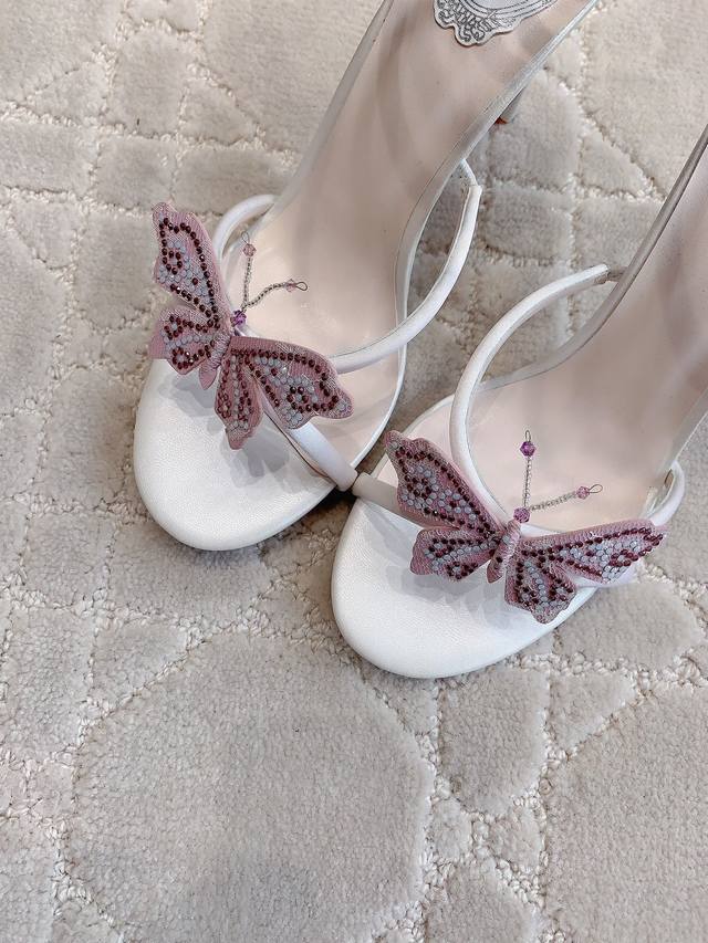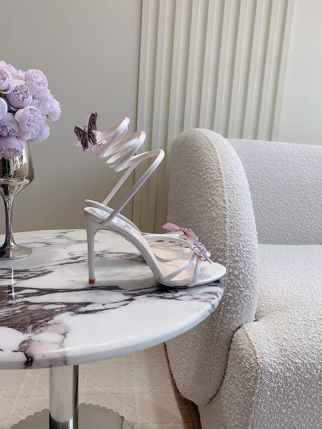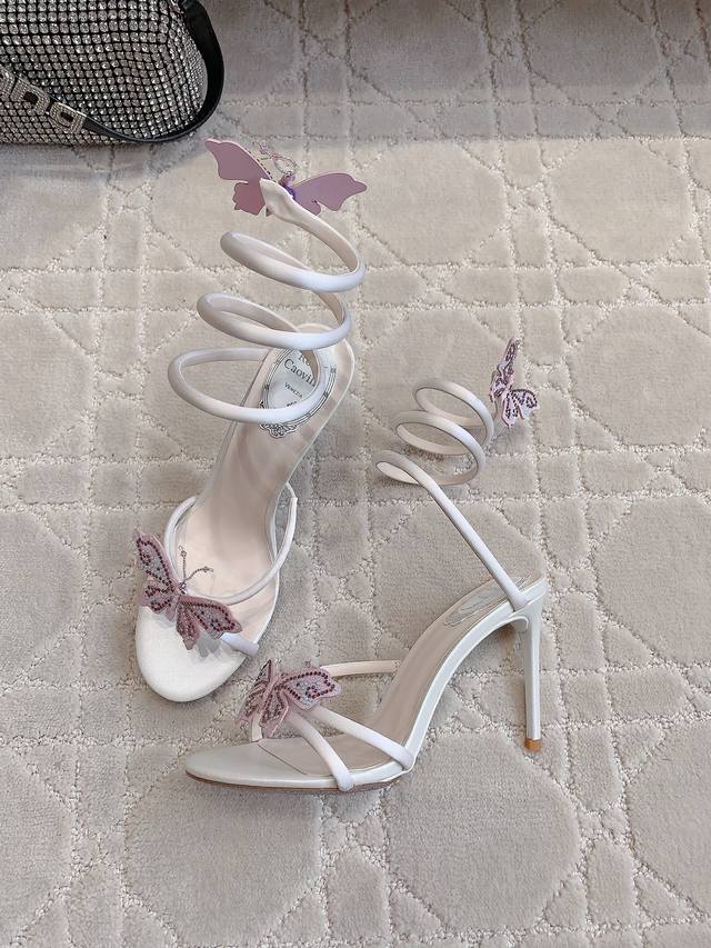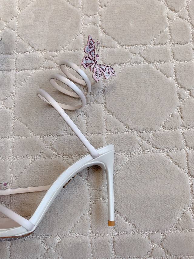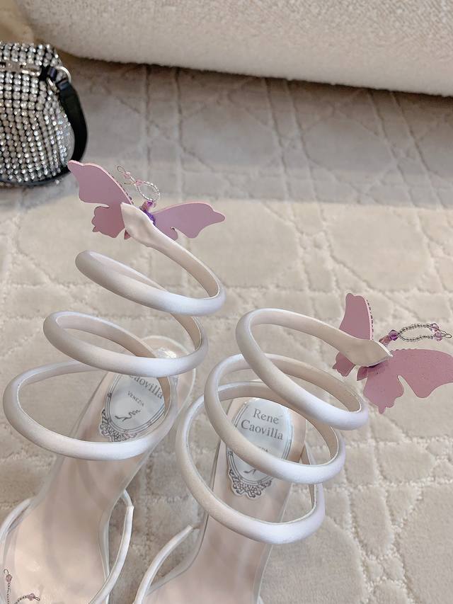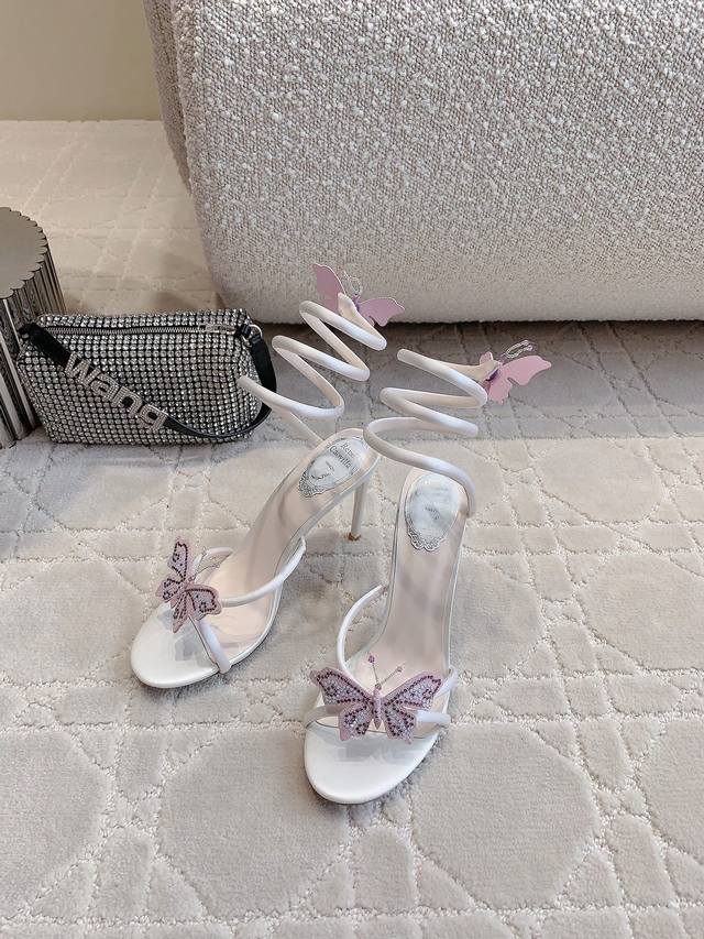 / Ren* Caovill* 经典蛇形缠绕高跟凉鞋 美丽灵动的纯手工蝴蝶点缀 增加甜美气息 鞋面真丝 搭配超闪水钻 内里垫脚羊皮 原版一致闪银真皮大底 跟高:9C