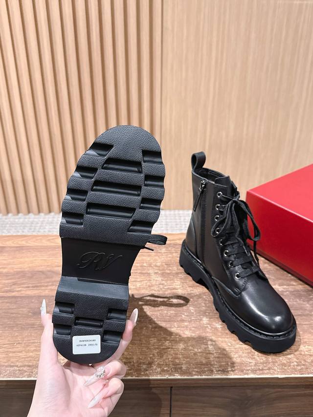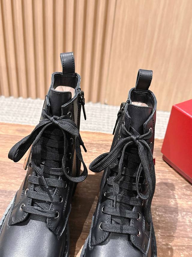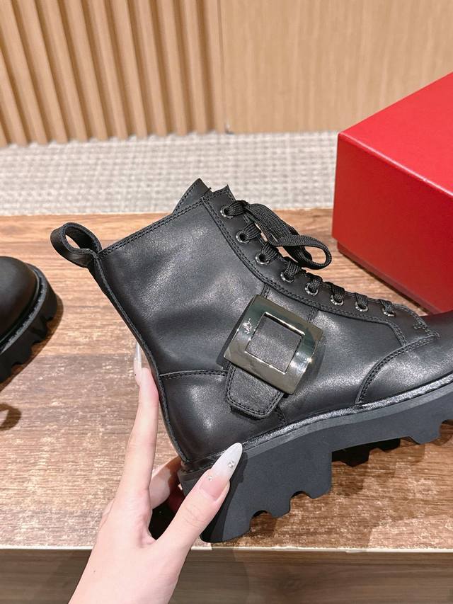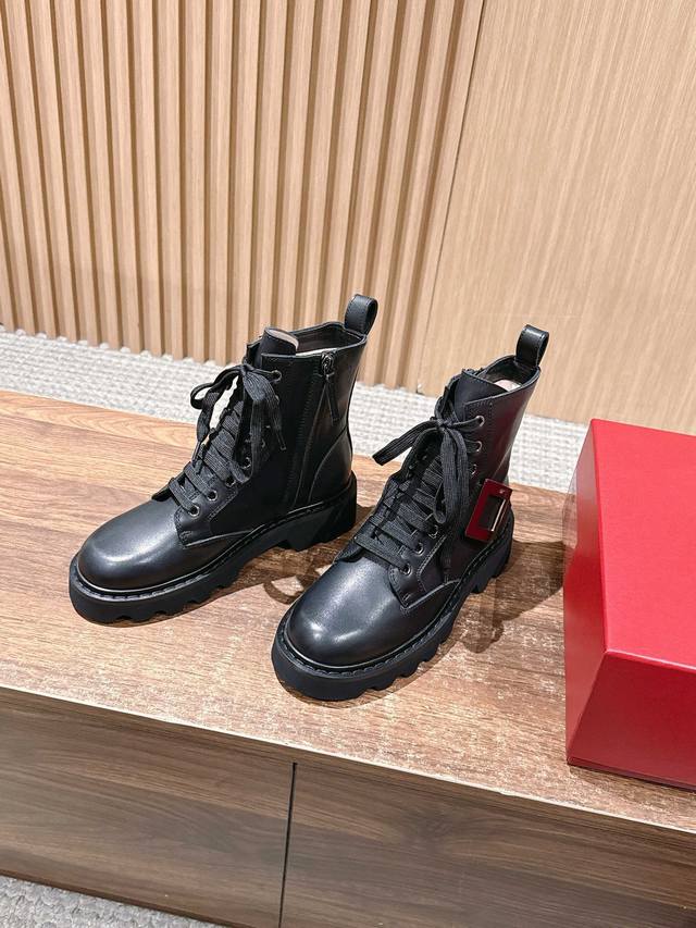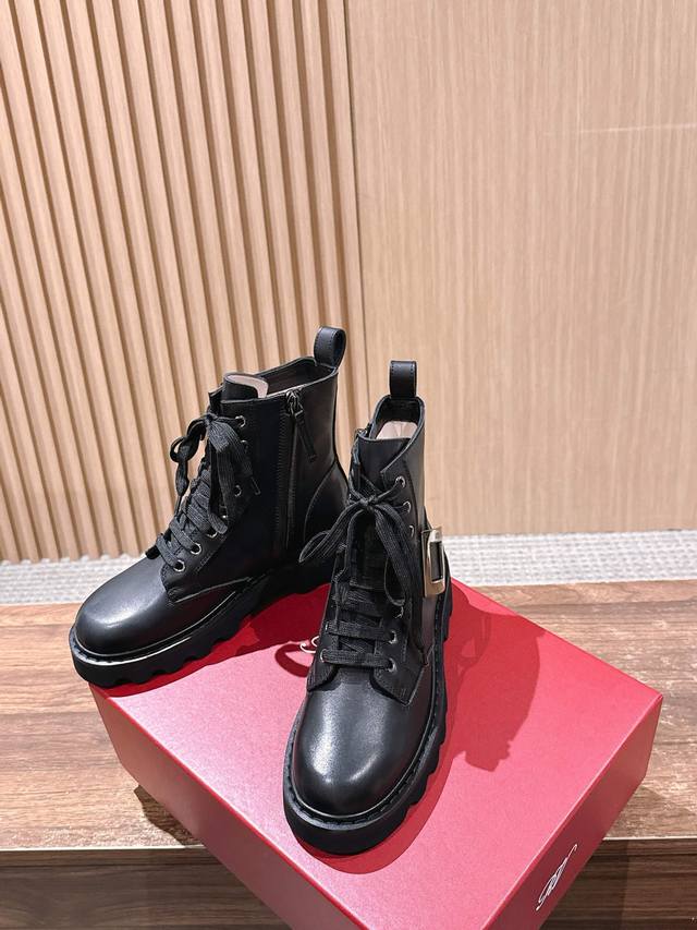 Roger Vivier 罗杰维维亚秋冬新款女靴 方扣中筒靴厚底英伦风马丁靴 DDD 绝美钻扣中筒靴,系带设计,上身显瘦修饰腿型。风格帅气十足,百搭时尚,标志性品牌钻扣闪耀着璀璨光芒,简约别致除了设计上更加有趣,也提升了舒适性。真皮大鞋舌设计,大面积前挡更加贴合腿部,更加显瘦,鞋面车线走线工整,精美油边可见制作细致用心。,绒感厚实柔软,优雅高贵,气场超强。 DDD 真皮内里和鞋垫舒适透气,皮质细腻,内有金色丝印,印刷精良。鞋帮后处的人性化拉带设计,方便穿脱,作为饰品的存在也是更为帅气一些,细节彰显品质工艺