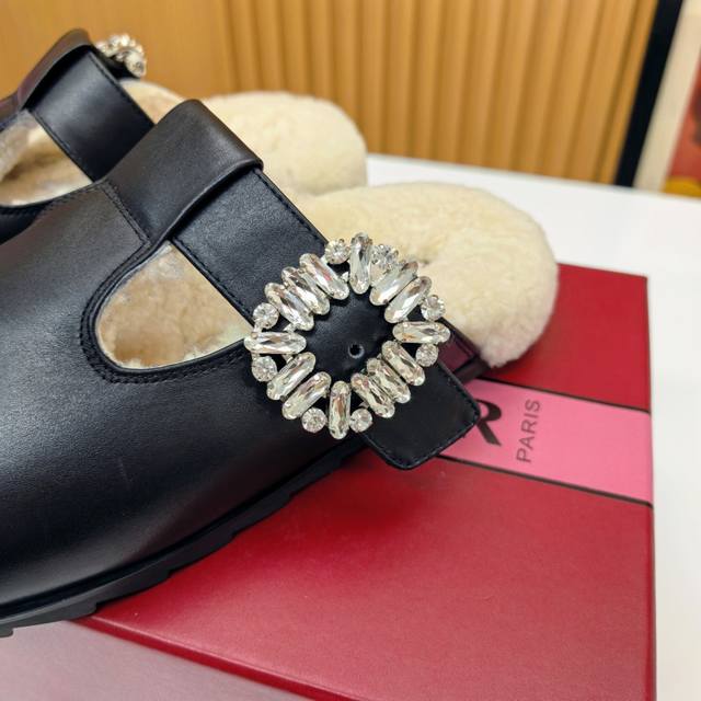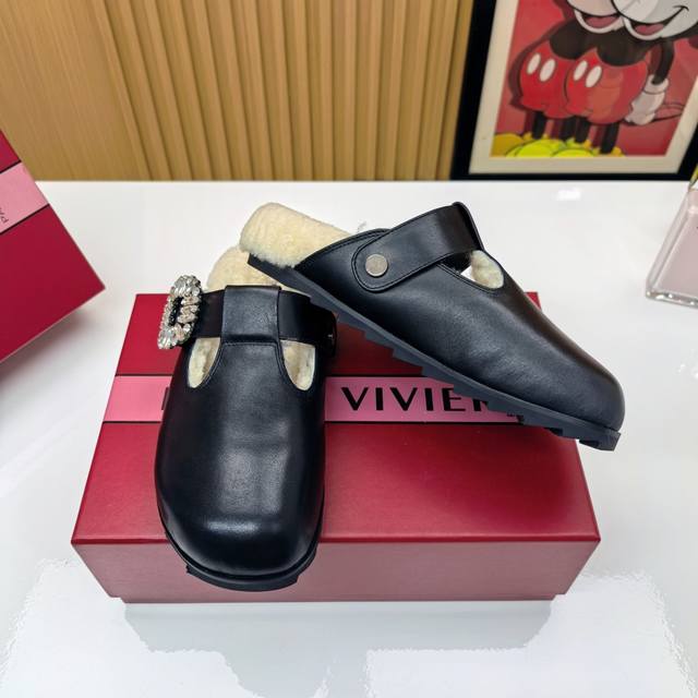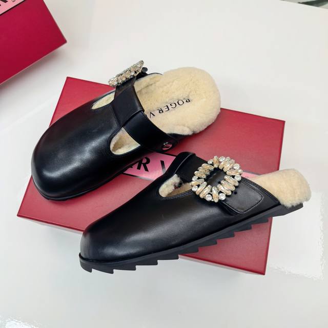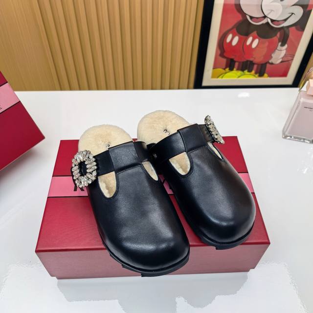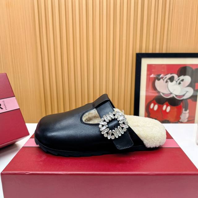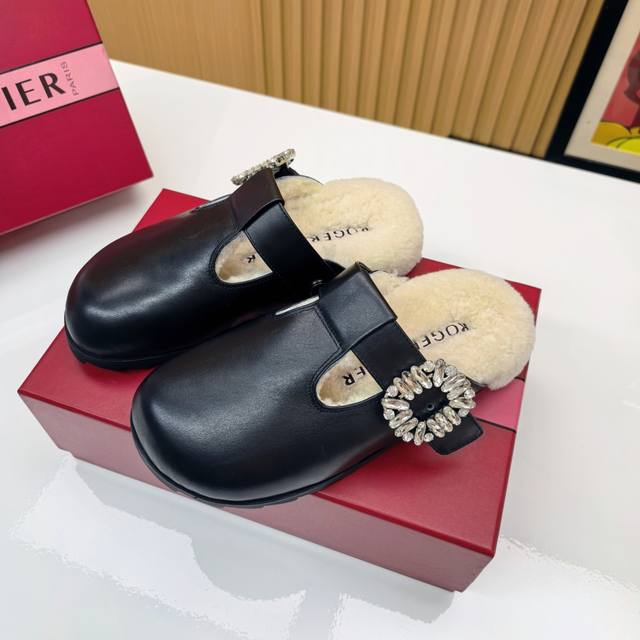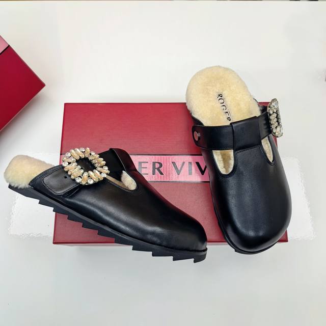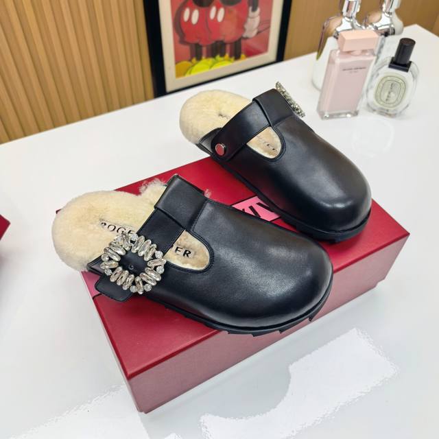Rv羊毛款勃肯拖鞋 把法式优雅穿在脚下 |Roger Vivier羊毛拖鞋 Rv这款羊毛拖鞋直接把巴黎沙龙搬进你家客厅! 澳洲美利奴羊毛+标志性钻扣设计 从脚底