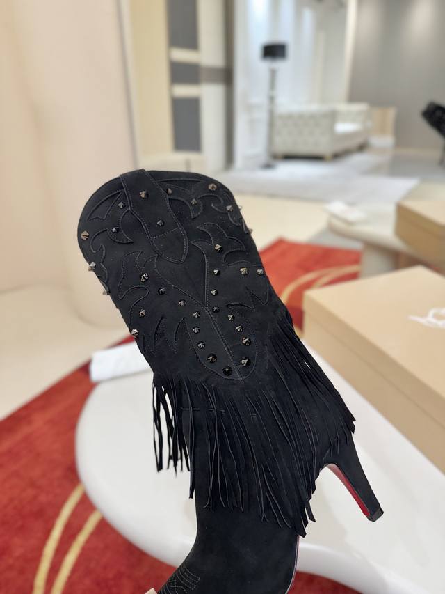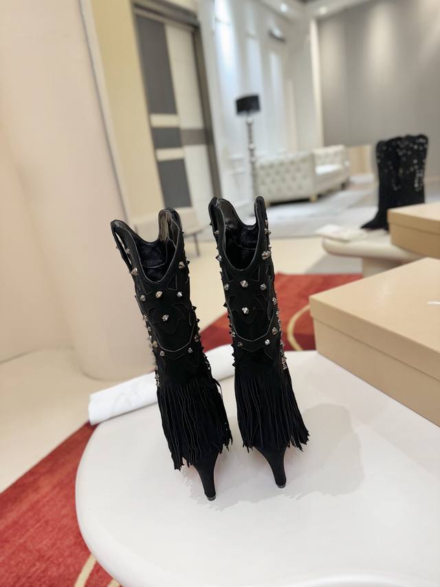/ Santia Fringe靴子借鉴了牛仔靴的灵感,重新设计了尖刺和皮革切割的有趣融合,最后以瀑布般的流苏覆盖脚踝。这双靴子带有长长的尖趾和85毫米的细高跟跟。它