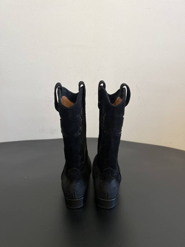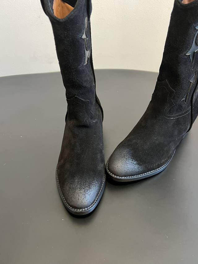 Sartor* 复古微喇镂空牛仔靴 DDD 属于西部牛仔靴风格,保留经典牛仔靴的轮廓与细节,同时融入现代时尚设计语言。鞋面采用反绒皮材质,触感柔软且质感高级;部分区域运用切割雕花工艺,呈现出独特的图腾纹理,提升视觉层次与复古韵味。 DDD 靴筒为微喇型,贴合小腿线条又具宽松感,兼具修饰腿型与舒适穿着的特点;鞋头呈修长尖型,延续牛仔靴的标志性轮廓。靴筒边缘的缝线、鞋跟的简约设计等细节,强化了单品的工艺感与整体性,让复古风格更显精致。 DDD 鞋面:牛皮 DDD 内里:牛皮 DDD 大底:真皮大底 DDD 增
