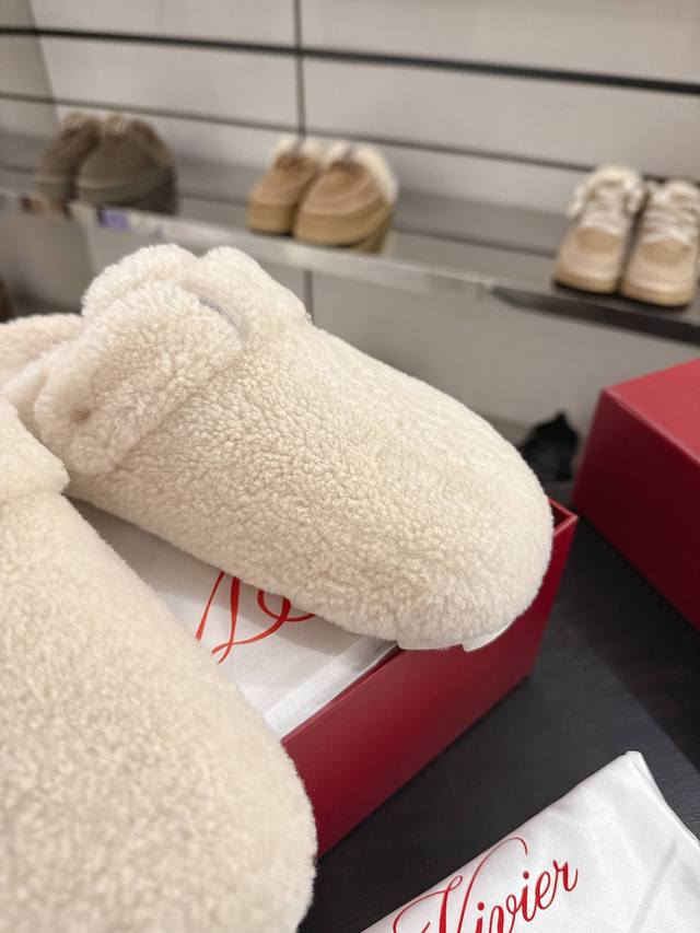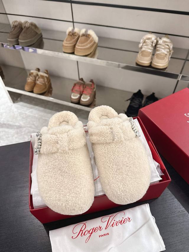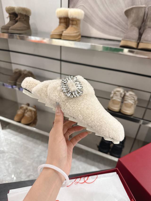 / Slidy Viv'系列糅合舒适设计和淑女风格,尽显松弛感。本款穆勒鞋以皮毛一体材料制成,T形扣带设计,点缀精致的闪钻饰扣,锯齿外底平稳舒适。 皮毛一体 闪钻饰