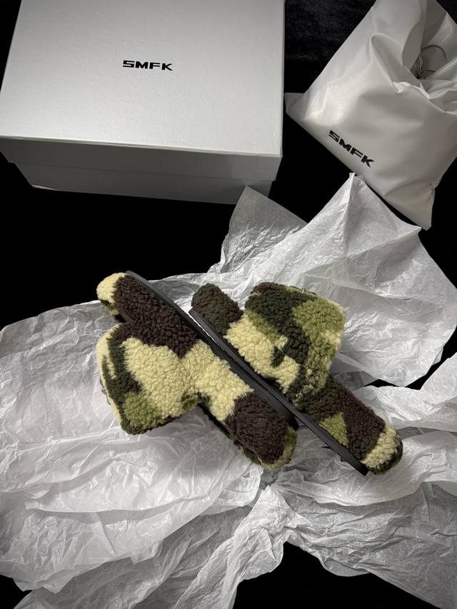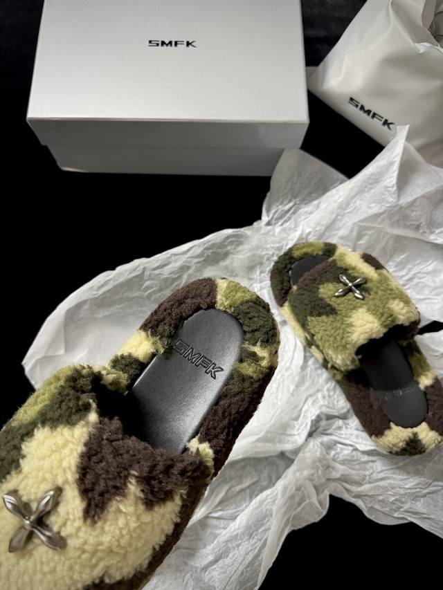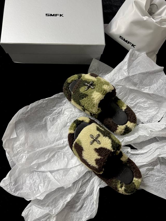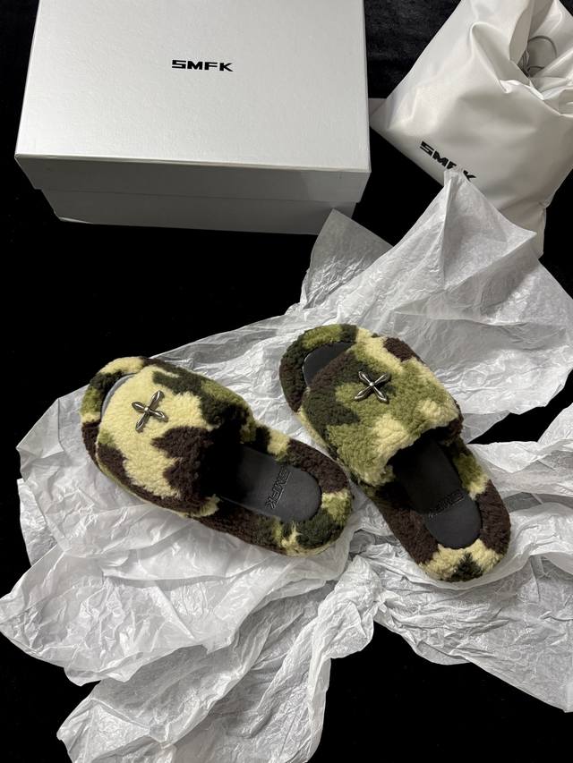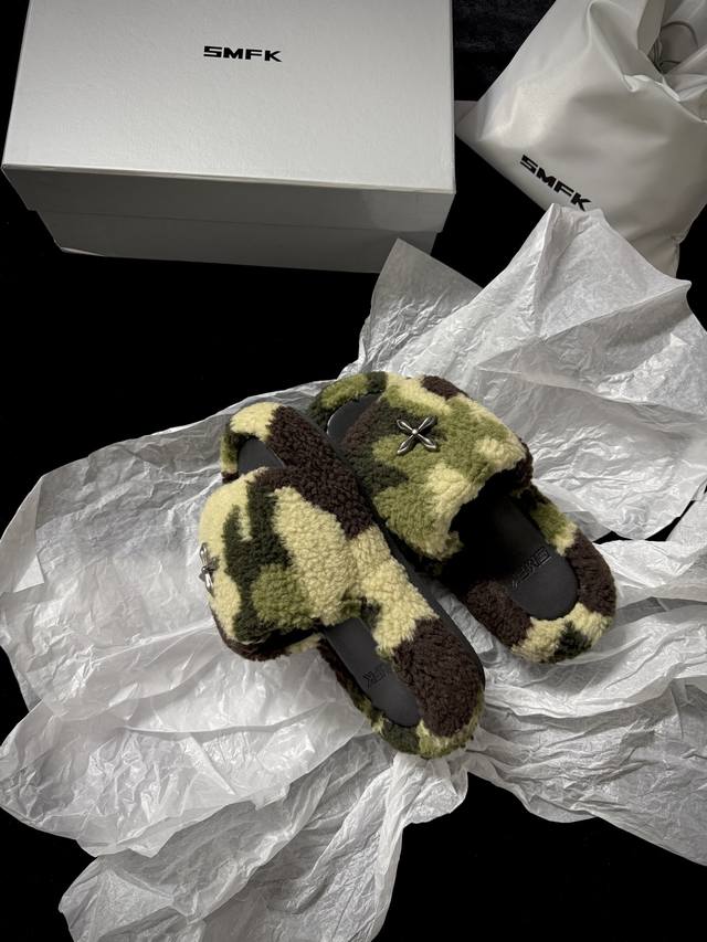 Smf* 单品 这双迷彩毛毛拖 把街头酷感和慵懒舒适焊死了 迷彩毛绒自带潮酷Buff 金属十字标又飒又有态度 踩上脚就是松弛感天花板 在家是慵懒时髦精 出门搭个