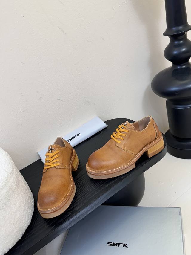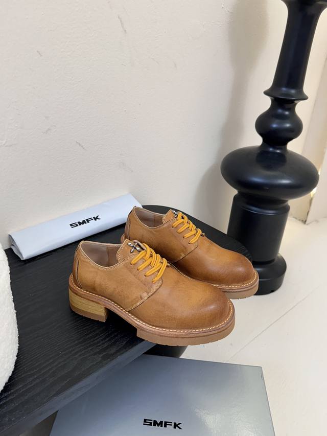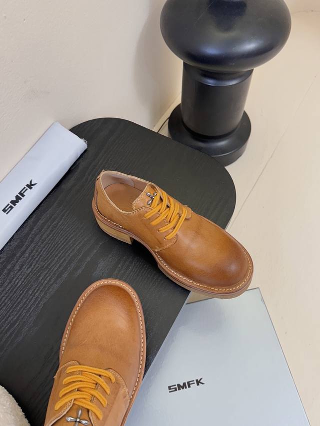 Smf* 野性起源固特异中筒靴 Rage野性手工的鞋履系列,传承延续经典鞋履制造工艺,从材料制作与挑选出发,打造具有Smfk野性美学的的原生感鞋靴系列。 野性起源系列,采用古典的水染鞋履制作工艺,原色皮质鞋展制成后,将染料与批次的鞋履在滚筒中水洗染色,在滚动的过程中,鞋身的皮质和鞋底的皮质上色井互相打磨拋光,让皮质拥有斑驳的颜色的同时,也体现皮质自身紋理及油润光泽。 固特异 Goodyear 手工鞋履制做工艺,将皮身与皮底結合,并适合长期穿着与使 用者更加契合。造型灵感来自草原牧民的马靴。鞋舌中心,銀嵌十