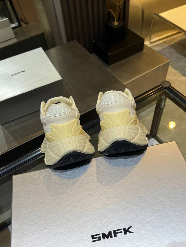 / Smfk品牌的厚底老爹鞋,鞋面采用黑色和白色拼接设计,带有独特的十字花纹标识鞋底厚实,具有良好的**效果,适合追求时尚和舒适的人群,在潮流界颇受欢迎,常用于日常