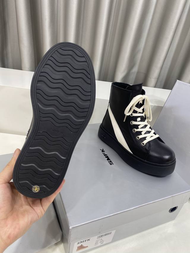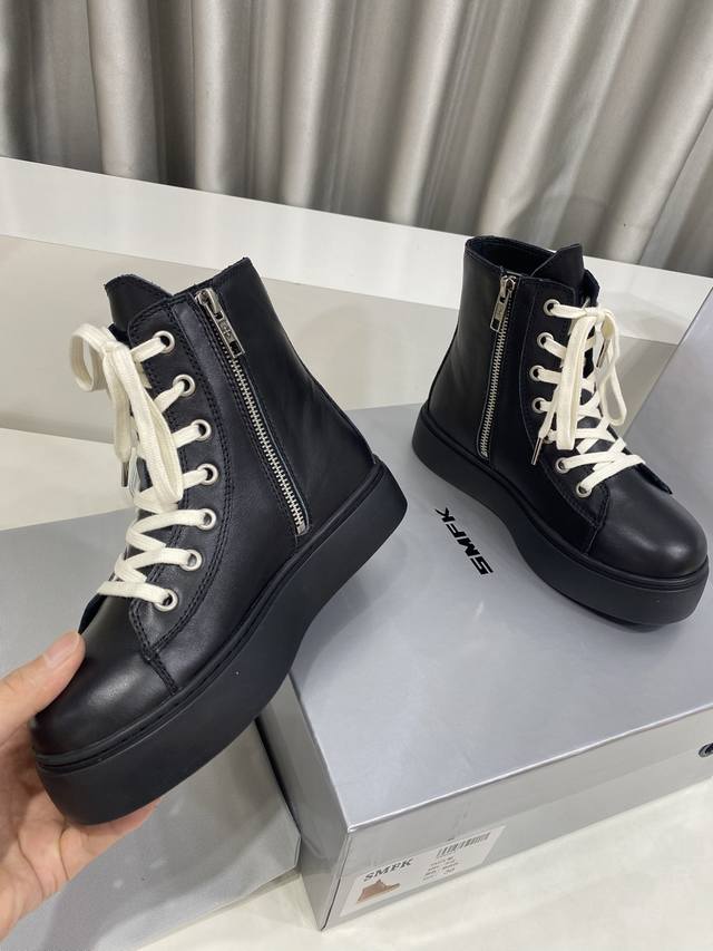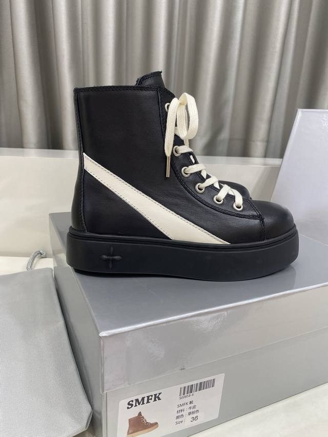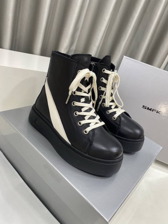 Smfk 小众潮牌 25Ss爆款新品 厚底 休闲鞋 马丁靴 这双Smfk单品,完美诠释了品牌独特的潮流态度与先锋设计理念。 厚底巧妙拉长腿部线条,让穿着者轻松拥有出众的身材比例 。而厚底侧面那一抹亮眼的尖角十字花图案,作为Smfk的标志性元素之一,不仅凸显了品牌特色,更赋予了鞋子独一无二的辨识度。 无论是搭配Smfk经典的运动套装,展现活力满满的运动时尚感;还是与简约的牛仔单品相组合,打造街头潮流风格,这双单品都能凭借其独特的设计和品牌魅力,成为穿搭中的焦点,让你自信地走在时尚前沿,释放独属于自己的潮流态